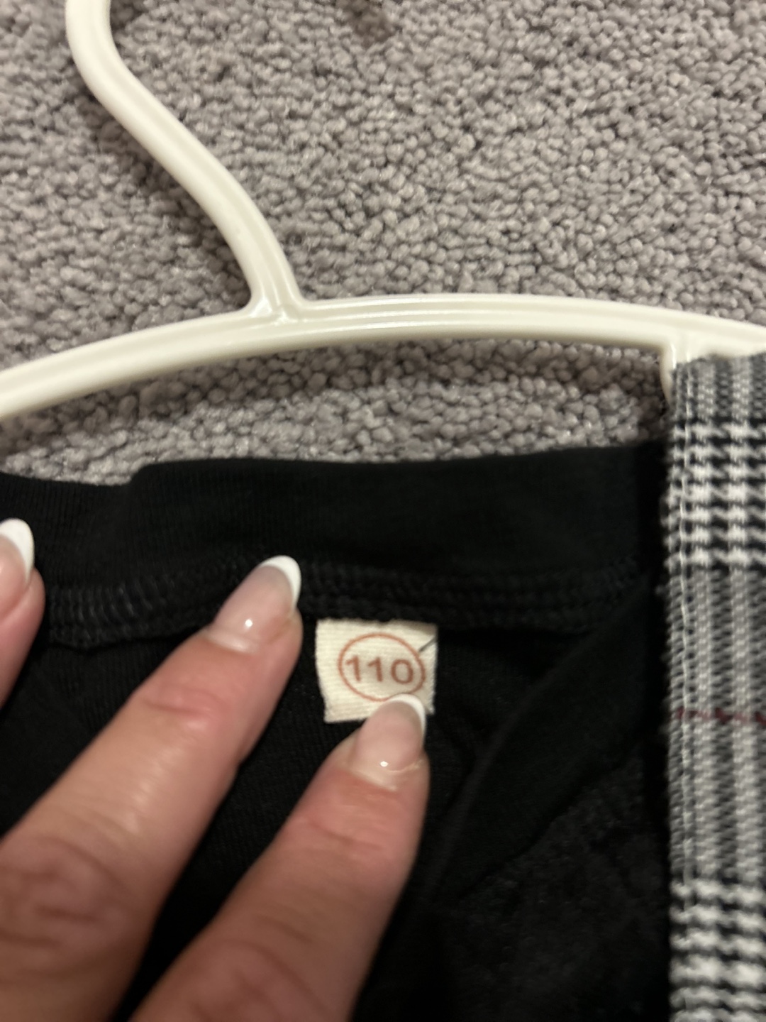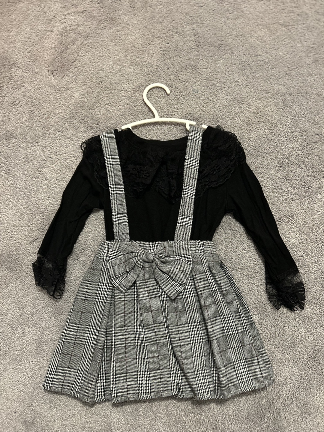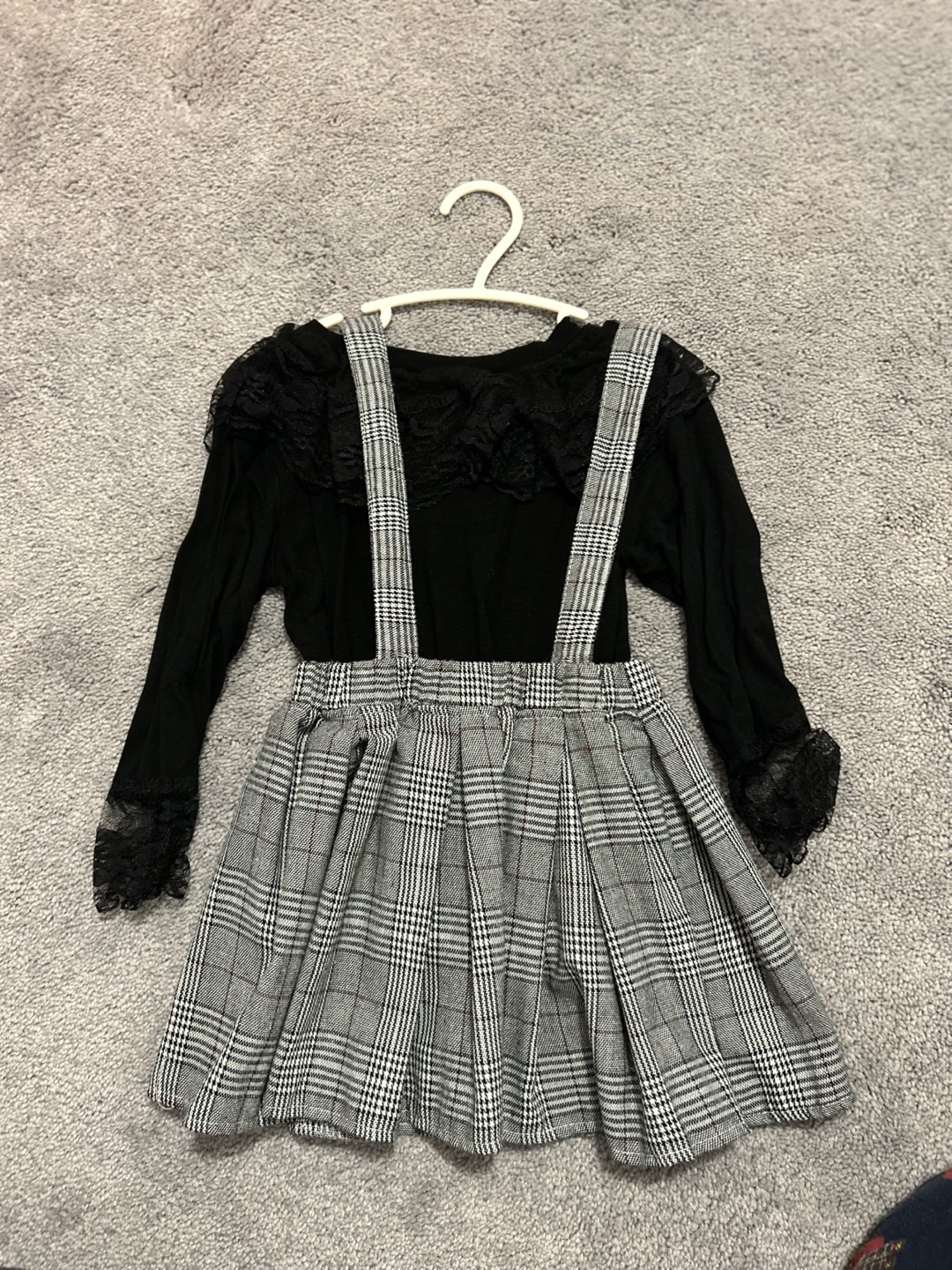 Cute little outfit for your little one! This is a girl's set featuring a black long-sleeved top with lace detailing and a plaid skirt with suspenders. The size is 110.