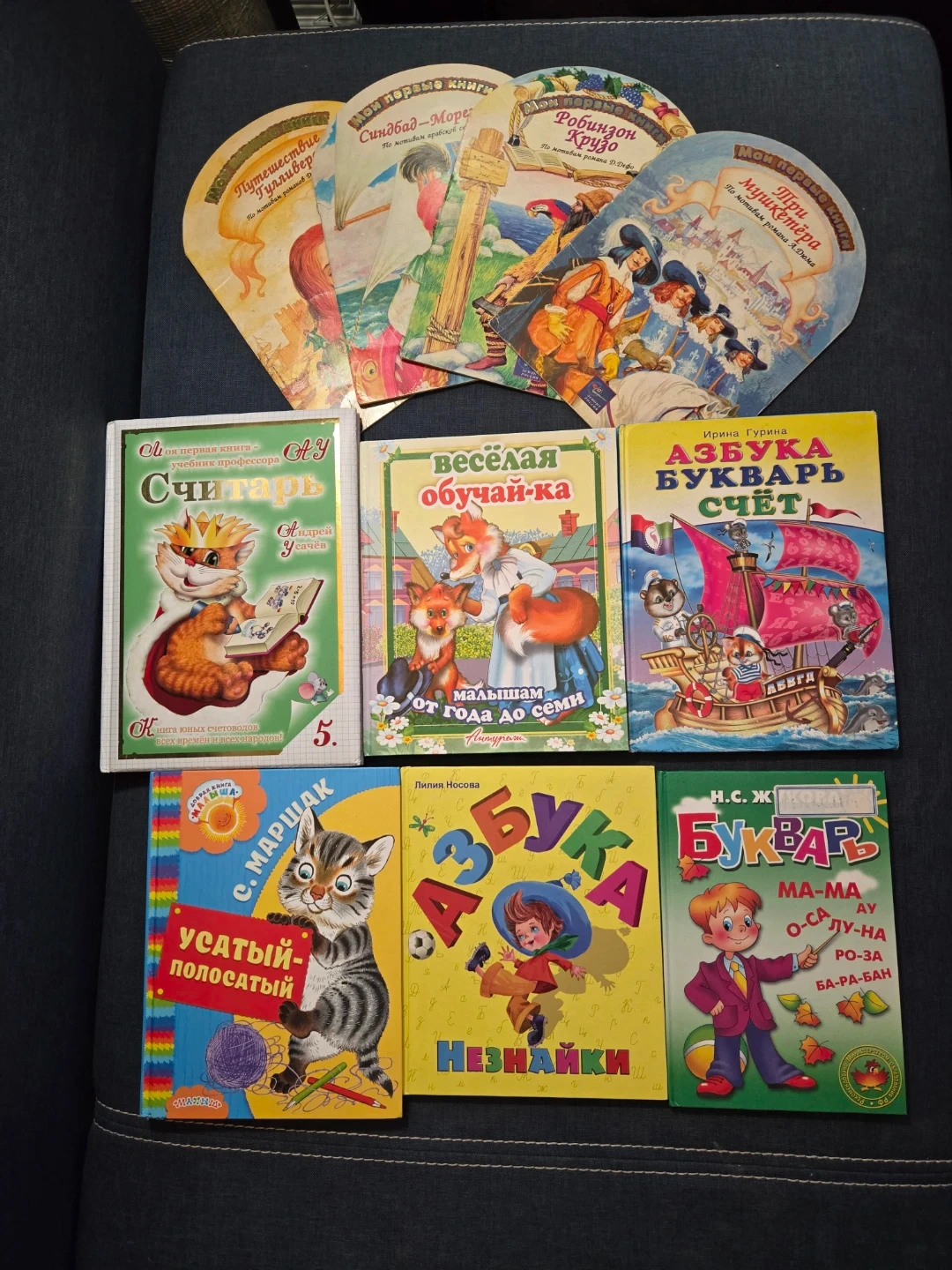 A set of children's books including educational and storybooks in Russian, designed for young learners.