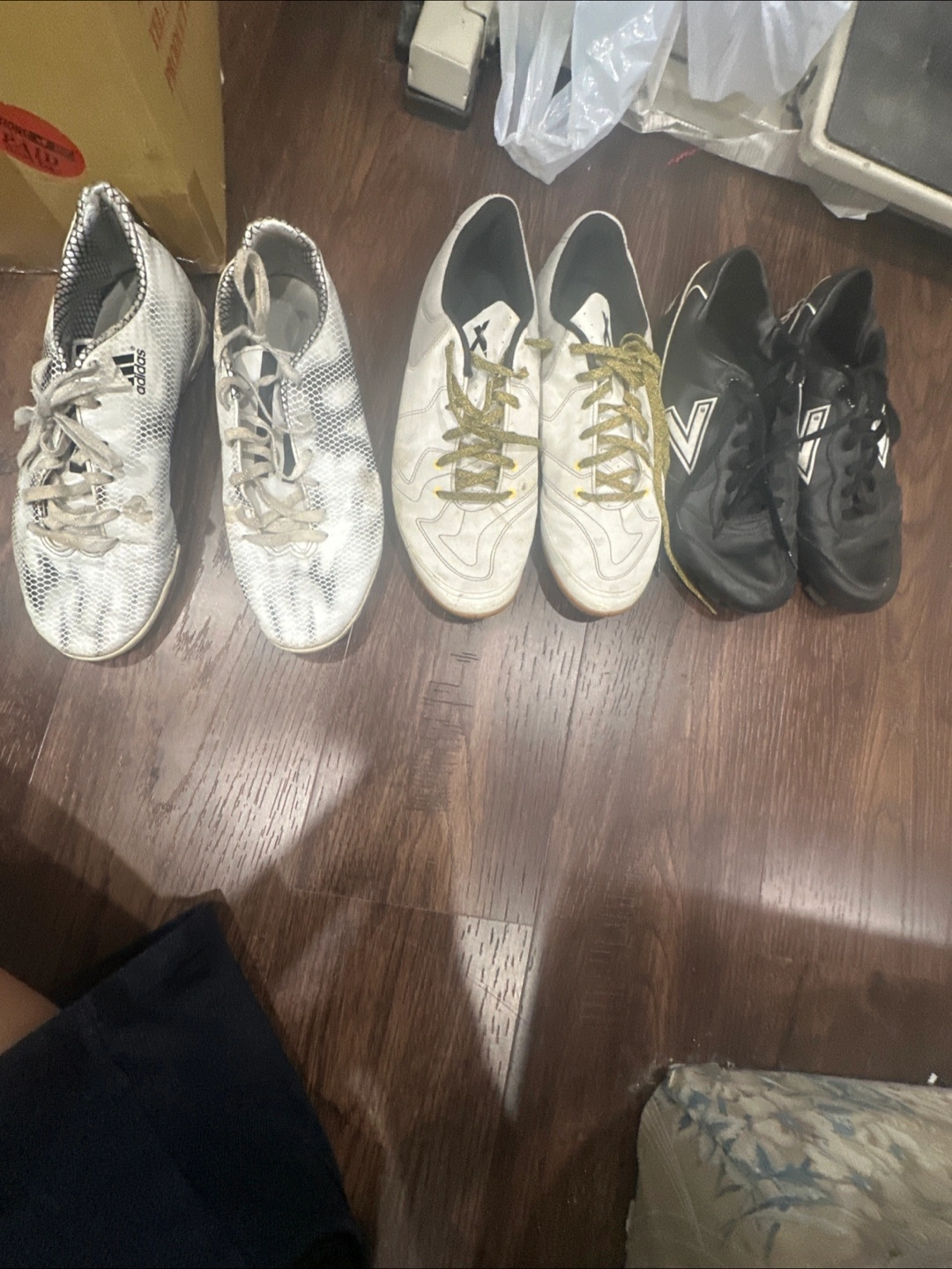 Selling a mix of used soccer cleats! There are two pairs of Adidas cleats and one pair of Mitre cleats. They have been used, as you can see in the photos, the adidas on the left are turf shoes and the one on the right are indoors. Each pair $10 or get them all for $25