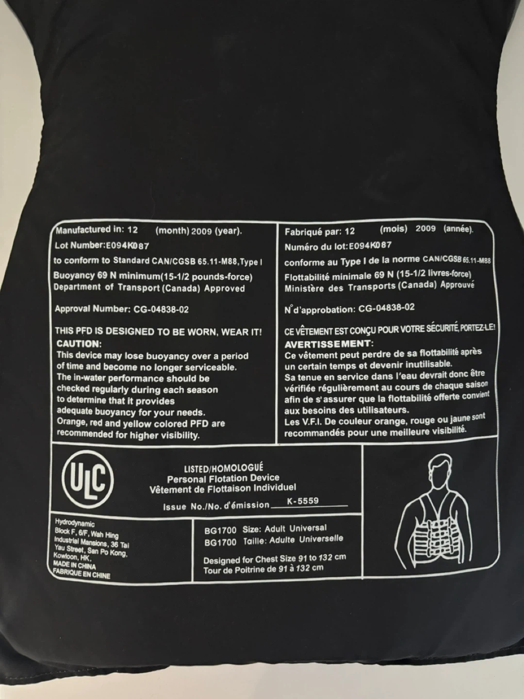 Hydrodynamic adult universal PFD for chest sizes 91 to 132 cm. Manufactured in 12/2009. This personal flotation device is Department of Transport (Canada) Approved.