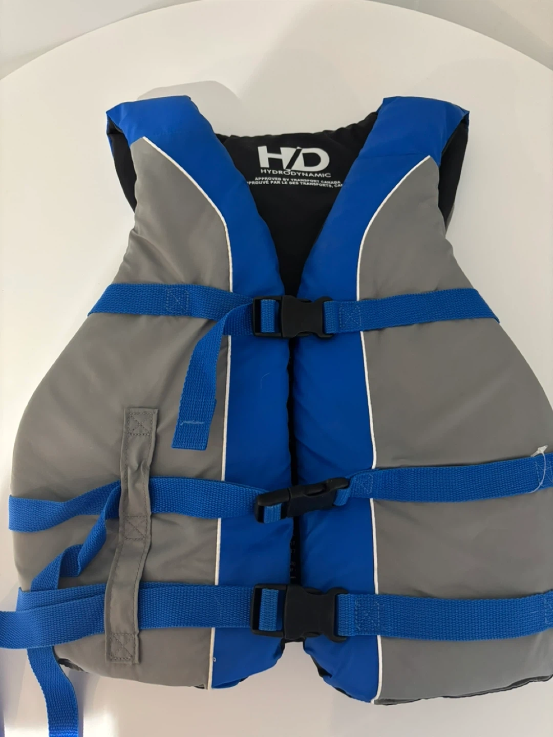Hydrodynamic adult universal PFD for chest sizes 91 to 132 cm. Manufactured in 12/2009. This personal flotation device is Department of Transport (Canada) Approved.