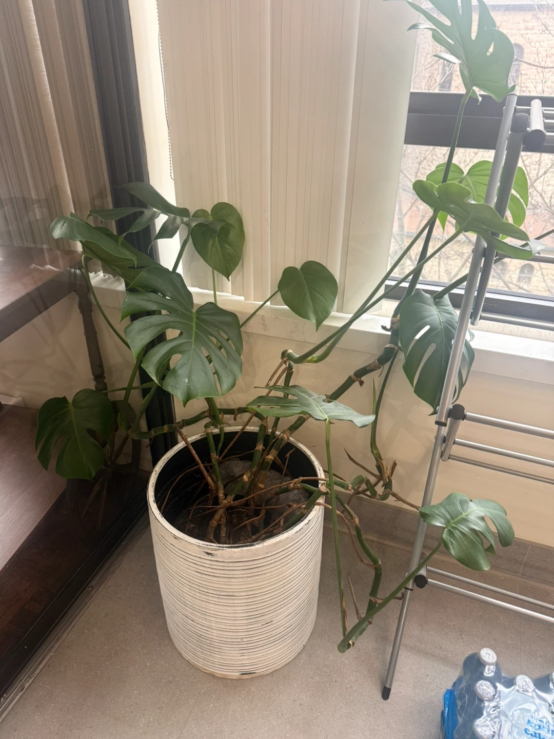 Large Monstera deliciosa plant in a decorative white ribbed pot. It's a mature plant with ample greenery. Needs a new home that can provide it with lots of light!