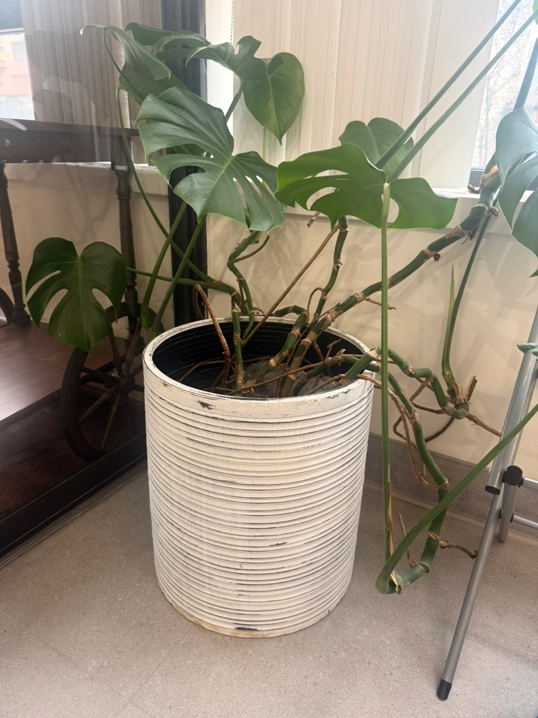 Large Monstera deliciosa plant in a decorative white ribbed pot. It's a mature plant with ample greenery. Needs a new home that can provide it with lots of light!