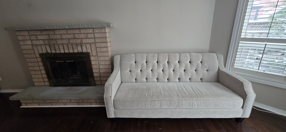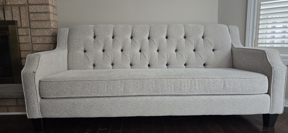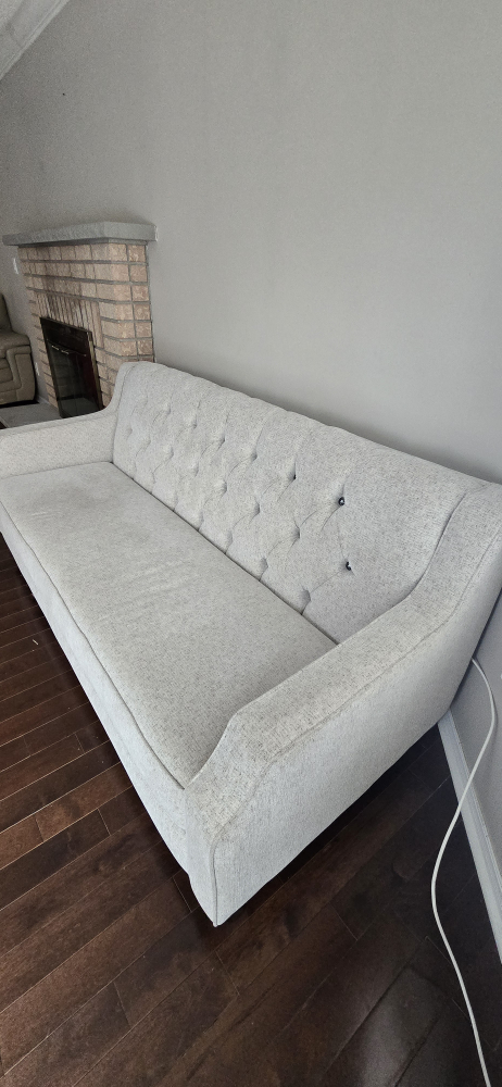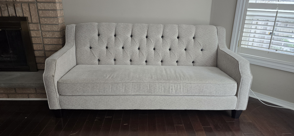 Selling a lovely tufted loveseat sofa. It's in great condition and would look great in any living room or den. The light grey colour is neutral and versatile, and the button-tufted design adds a touch of elegance. Delivery available