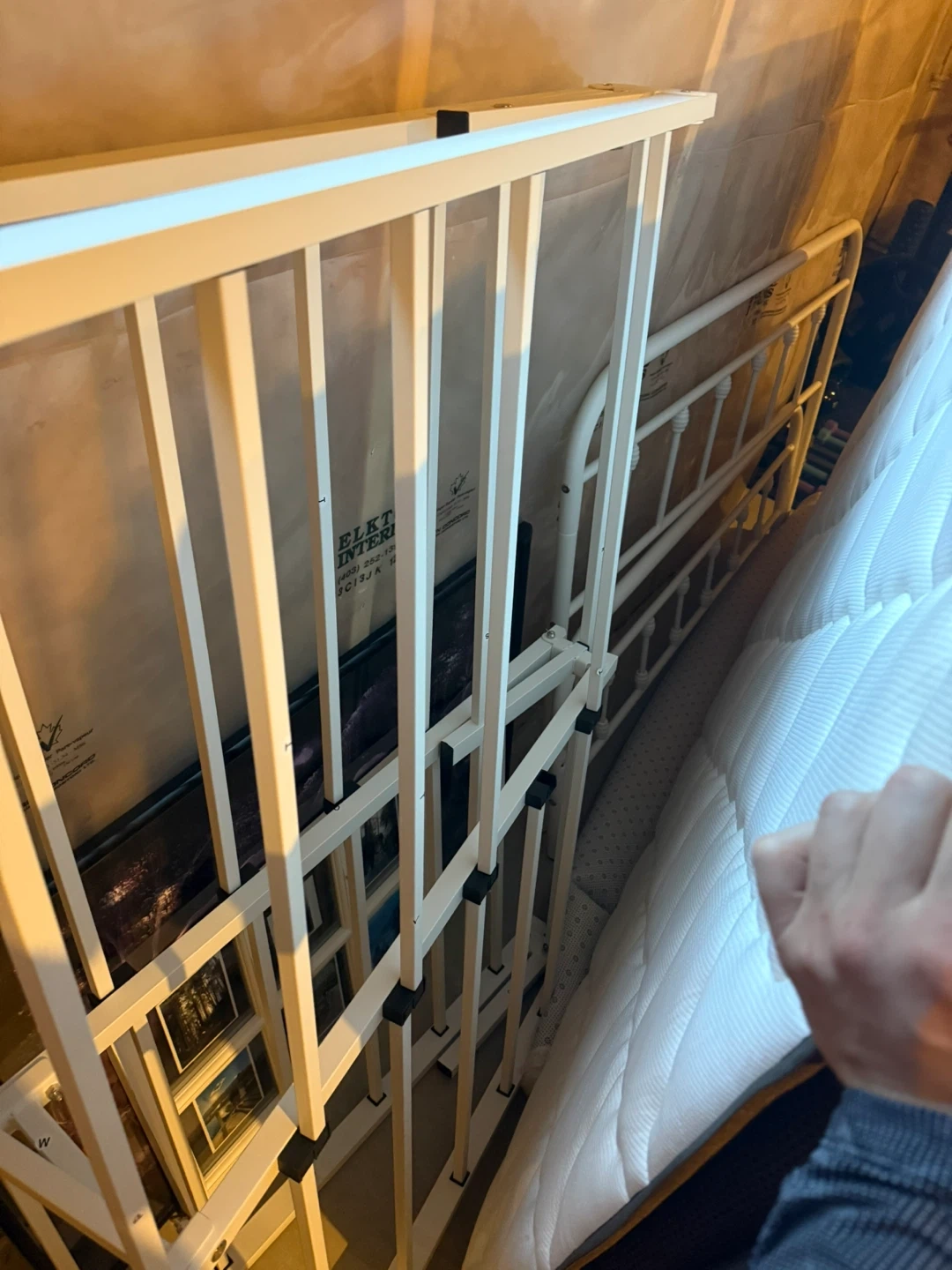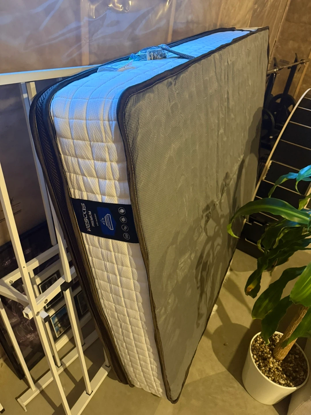 Restonic mattress, likely a double full size. It has a quilted top and a grey border. This mattress is brand new only used a few times. Comes with metal bed frame.