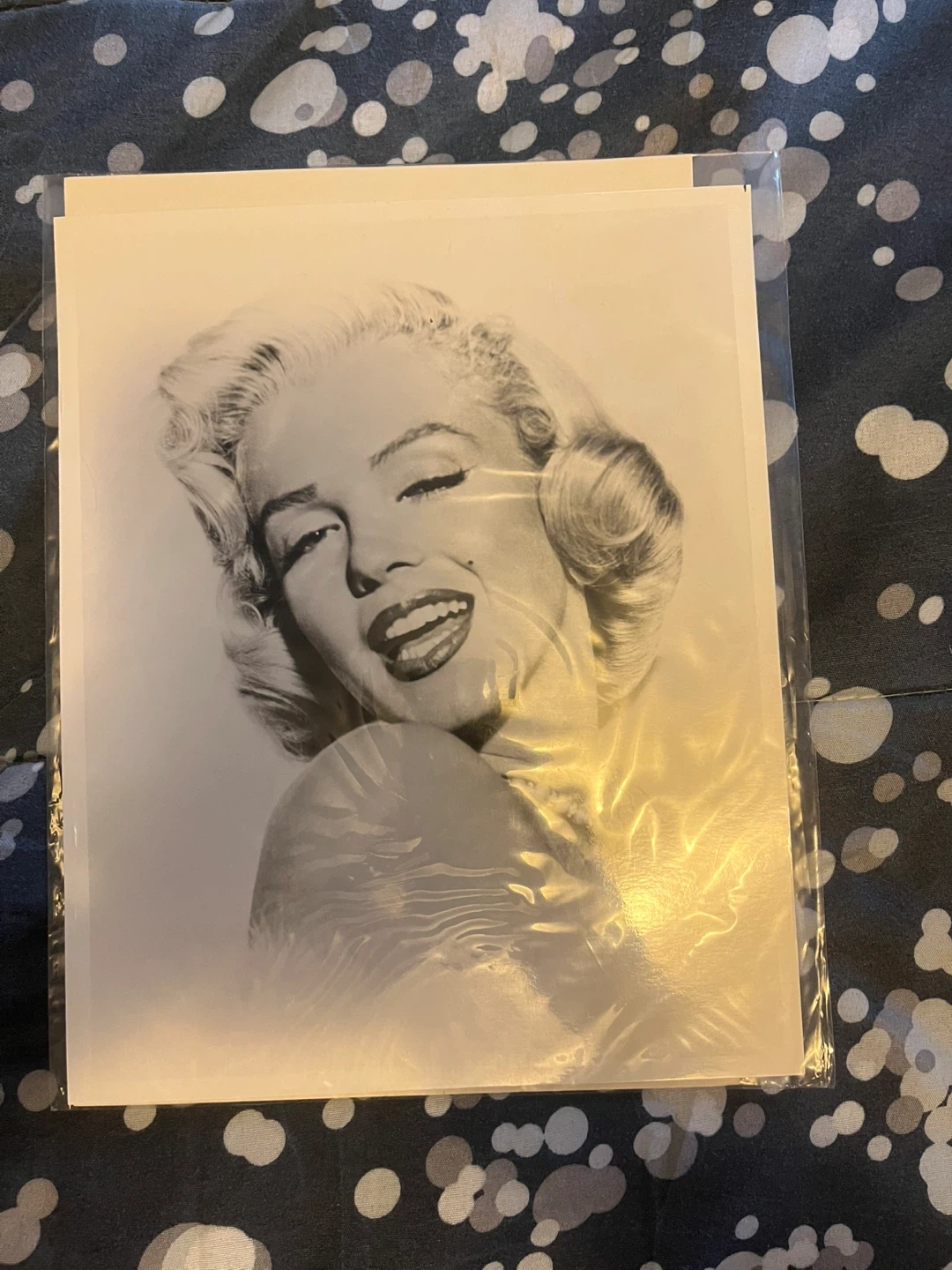 Black and white photograph print featuring Marilyn Monroe. It's a classic pose, perfect for collectors or fans of vintage Hollywood icons. Paper print.