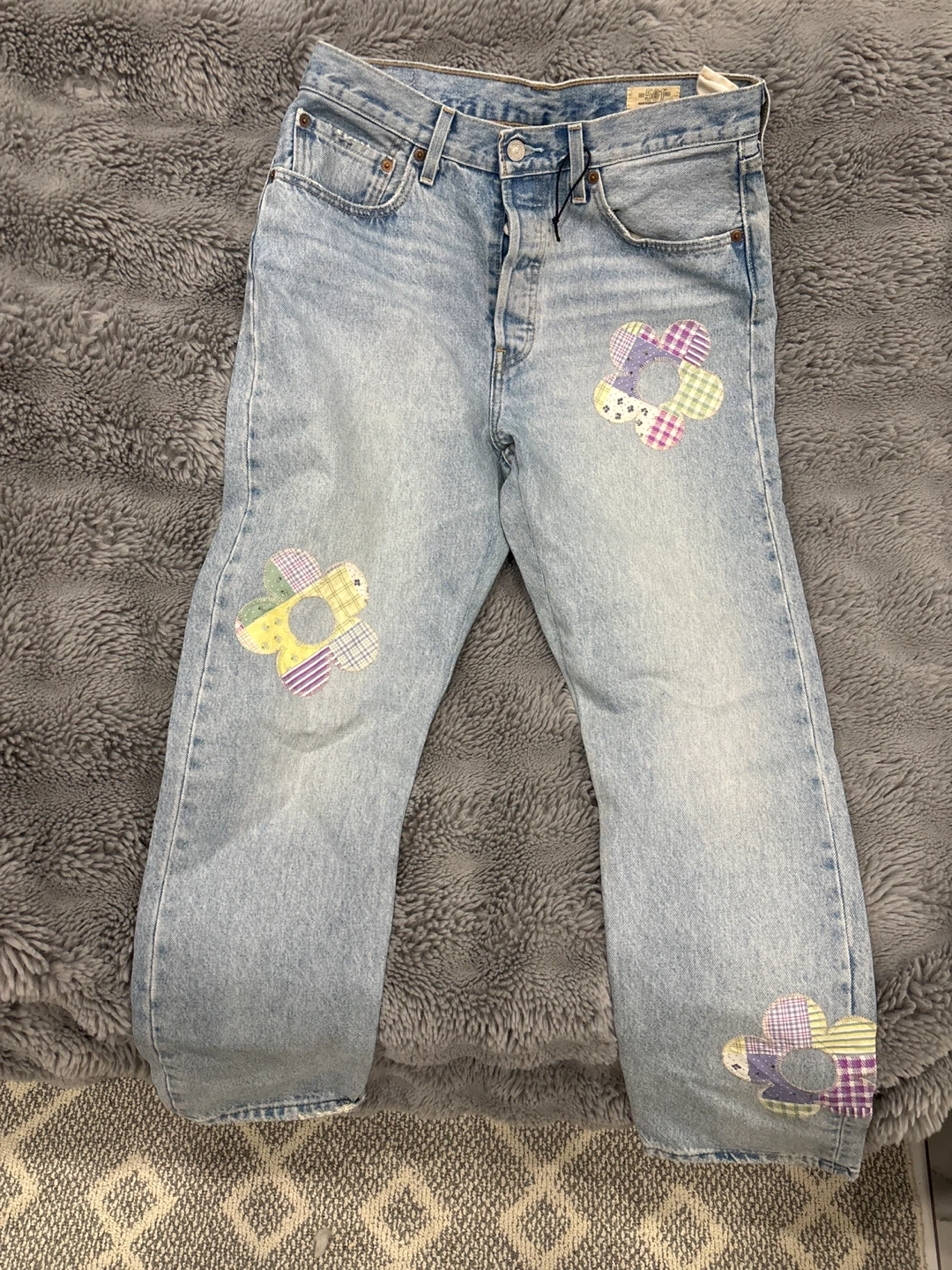 These light wash Levi's denim jeans have cute flower patches on the front and lower leg. They are a stylish addition to any wardrobe. Denim material.