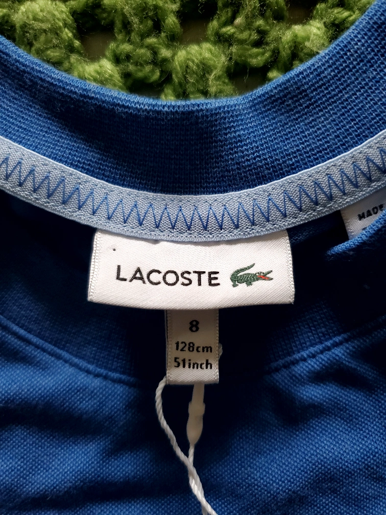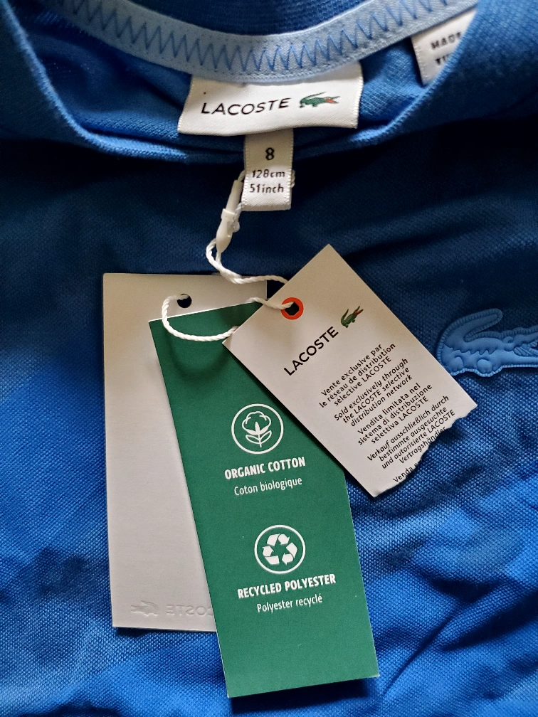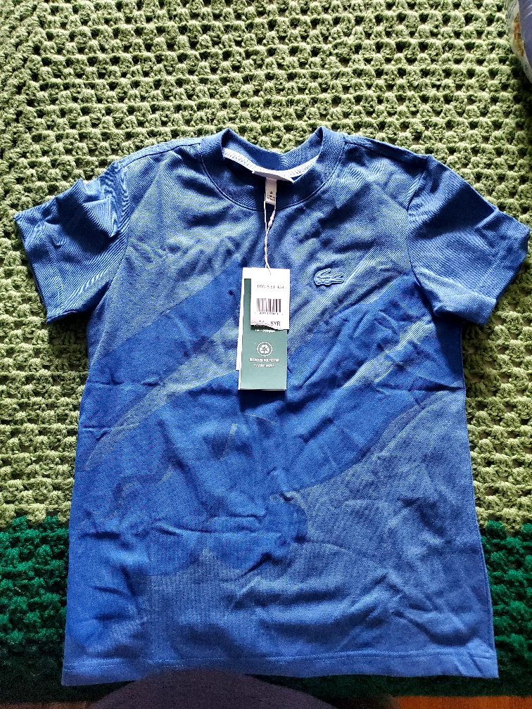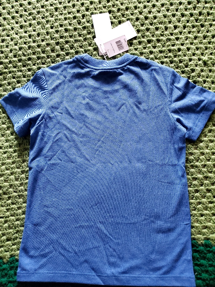 A new blue t-shirt, complete with tags. Made with organic cotton and recycled polyester. A nice piece of clothing to wear.size 8 kids
