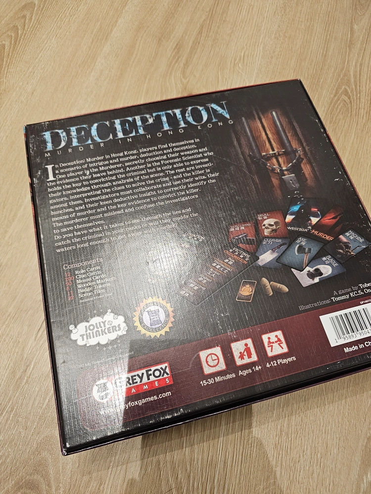 Selling the board game Deception: Murder in Hong Kong! It's a game for 4-12 players, ages 14+. Perfect for game nights with friends and family! It takes about 15-30 minutes to play. The box includes Role Cards, Scene Tiles, Means Cards, Evidence Markers, and Bullet Markers