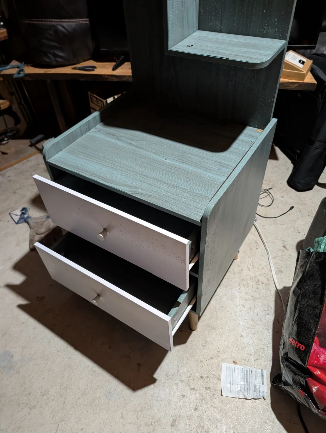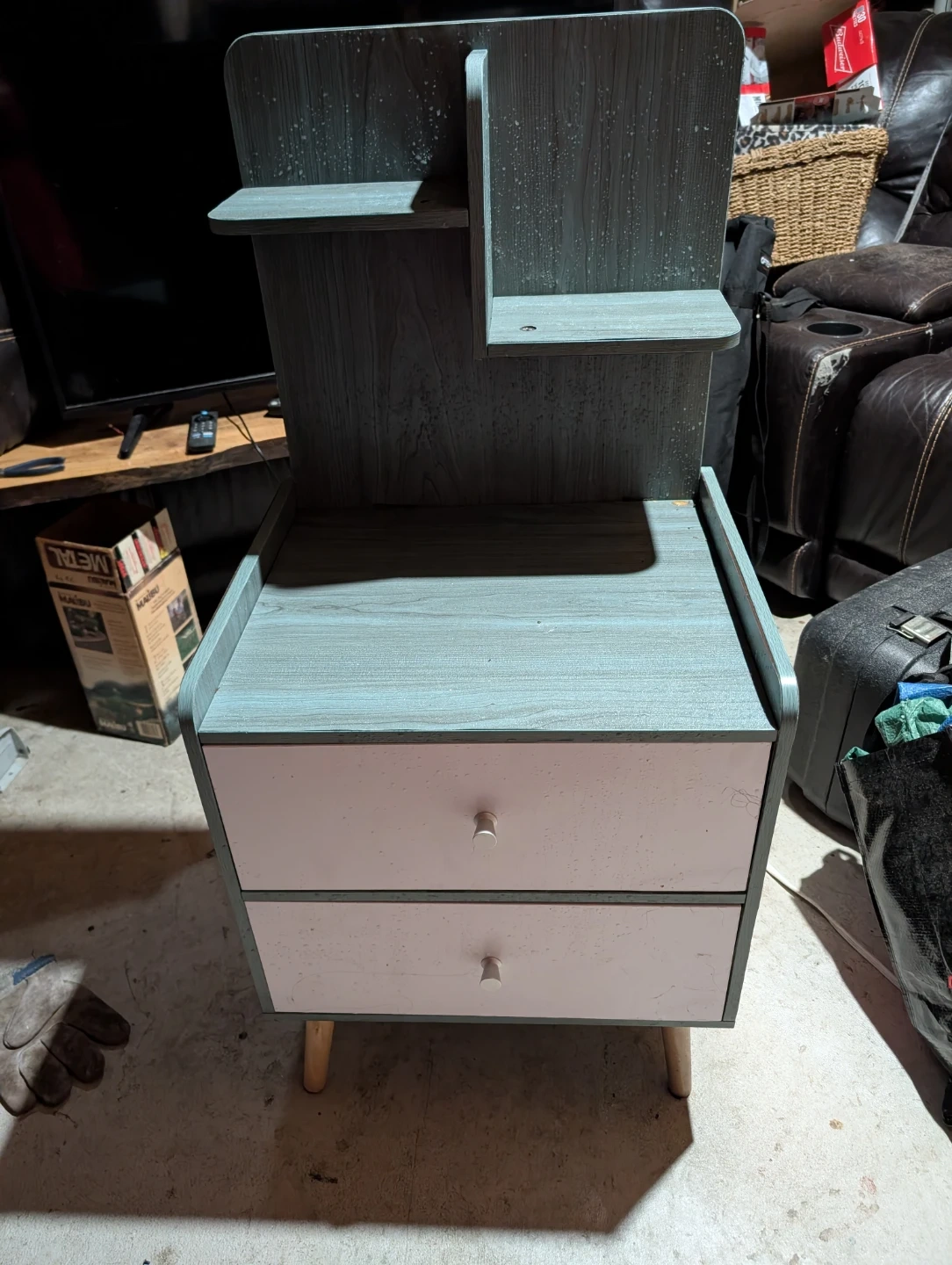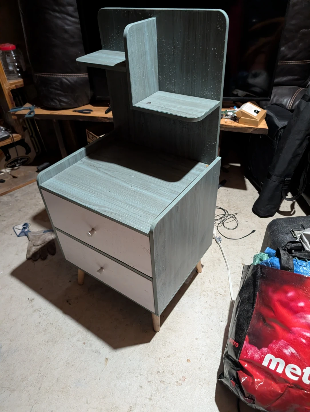 Selling a cute bedside table! It's got a unique design with shelves on top and two drawers at the bottom. The wood-look finish is a nice blue-grey colour, and the drawers are white. Perfect for adding some storage and style to your bedroom!