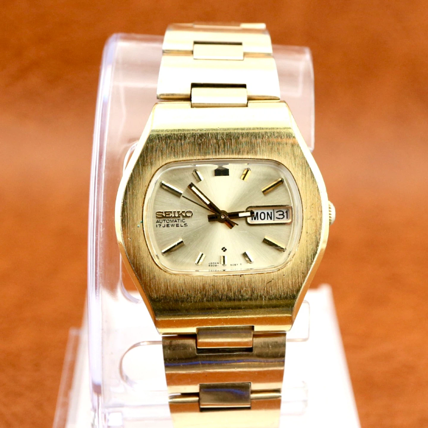 This is a vintage Seiko automatic watch with 17 jewels. It features a day and date complication. The watch is gold-toned with a matching bracelet. It's a classic timepiece for any watch enthusiast.