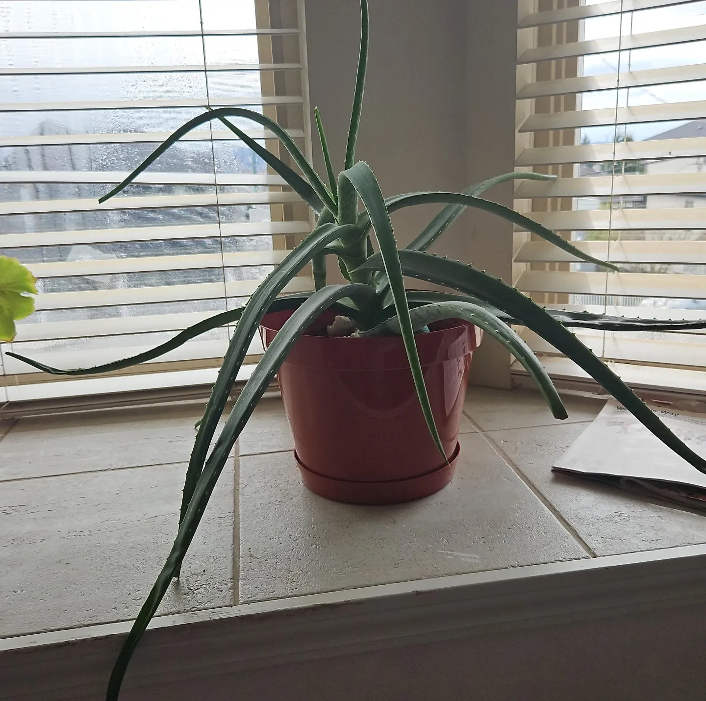 Healthy, well-established aloe vera plant. It's in a terracotta-coloured plastic pot with a matching saucer. It's a low-maintenance plant that's easy to care for. Great for a sunny windowsill!