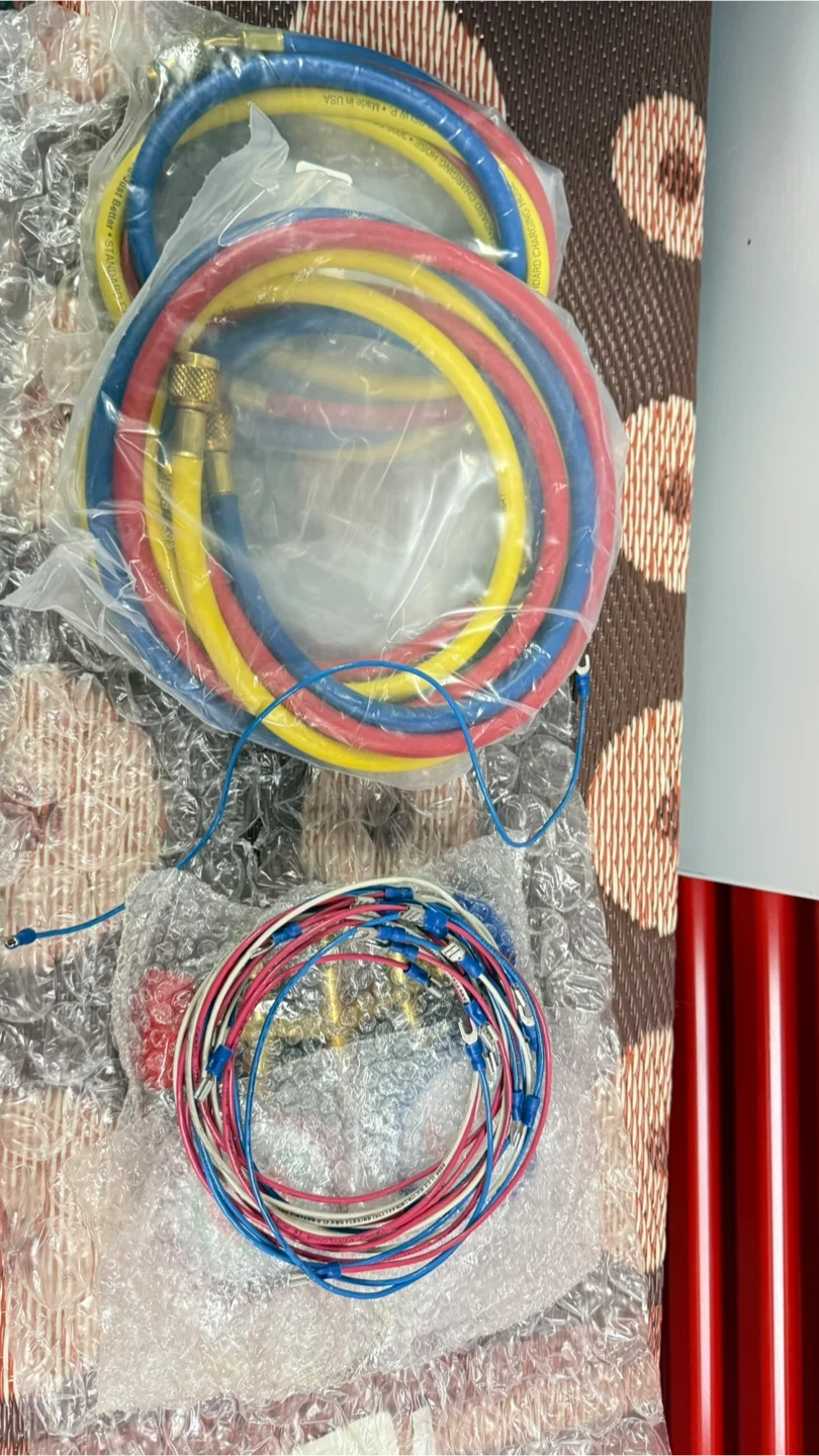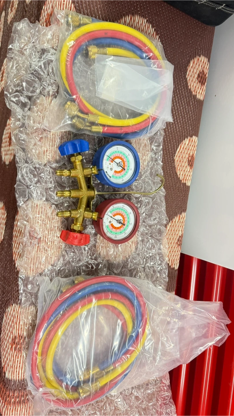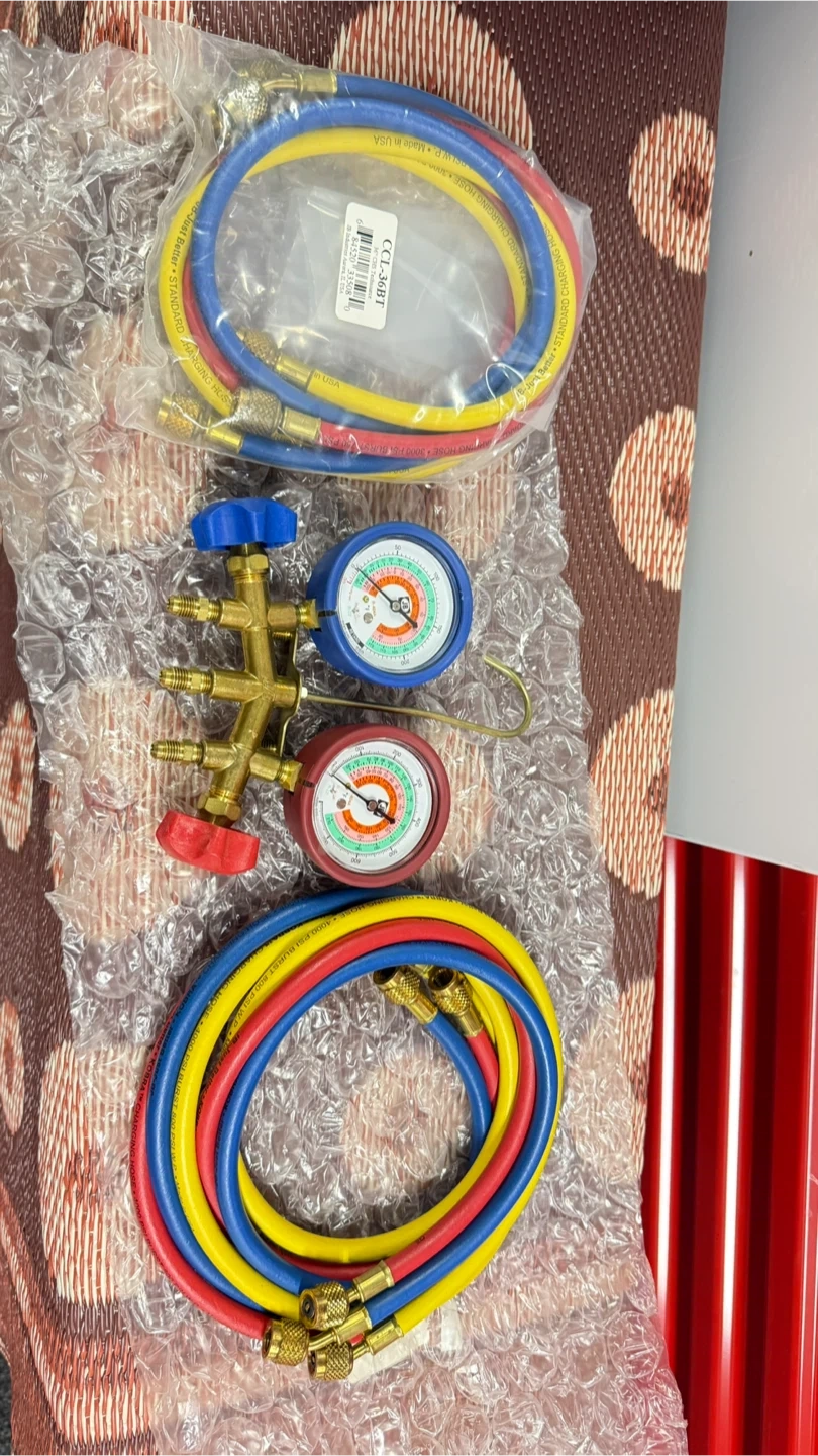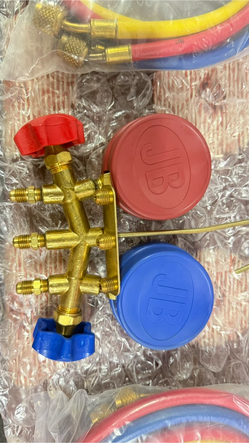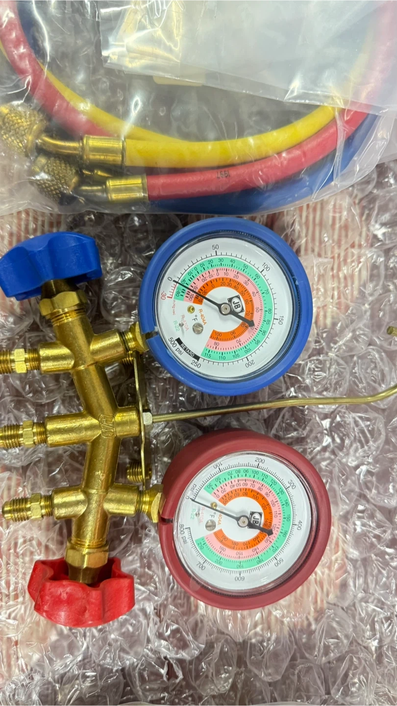This is a JB 4-gauge manifold set for HVAC work. It includes colored hoses for refrigerant charging. The set comes with a brass manifold and dual gauges.