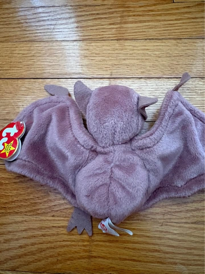 Soft brown plush bat with velcro on wing tips. This Ty Beanie Baby is made of polyester fiber and plastic pellets. It has tan felt ears and feet with a pink plastic nose.