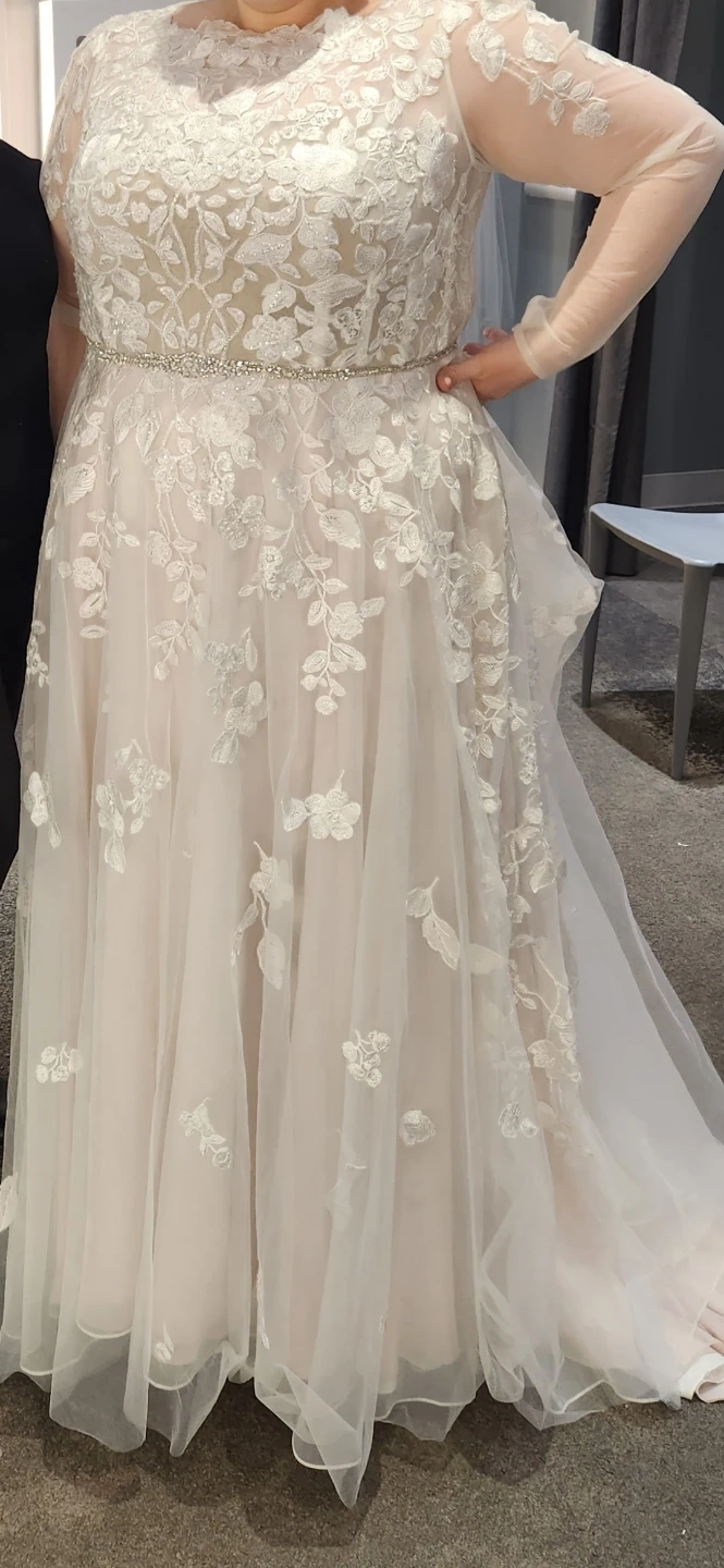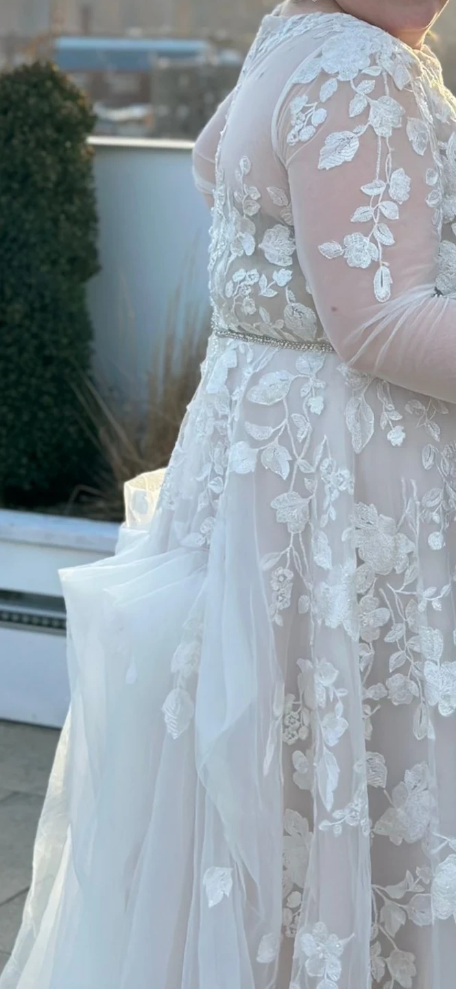 Here's a beautiful wedding dress that's ready for its next special day! It features delicate floral detailing and a flattering silhouette. Perfect for making unforgettable memories.