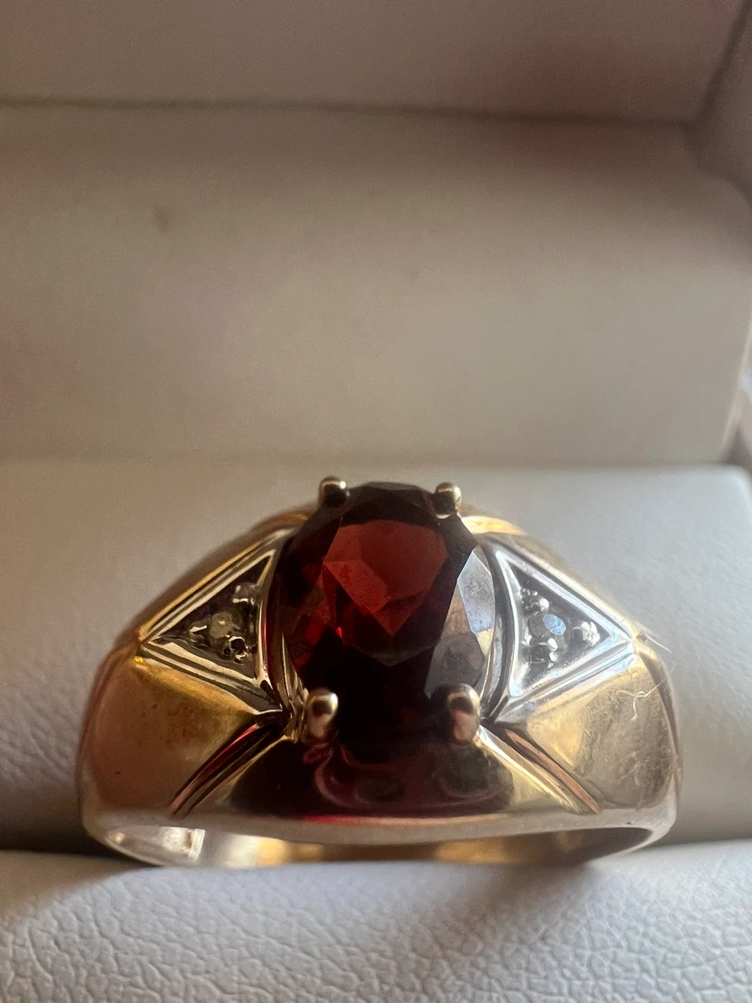 This is 10 k men's gold ring featuring a large oval garnet and two small diamonds on each side. The band is gold with a polished finish. It's set in a classic style.