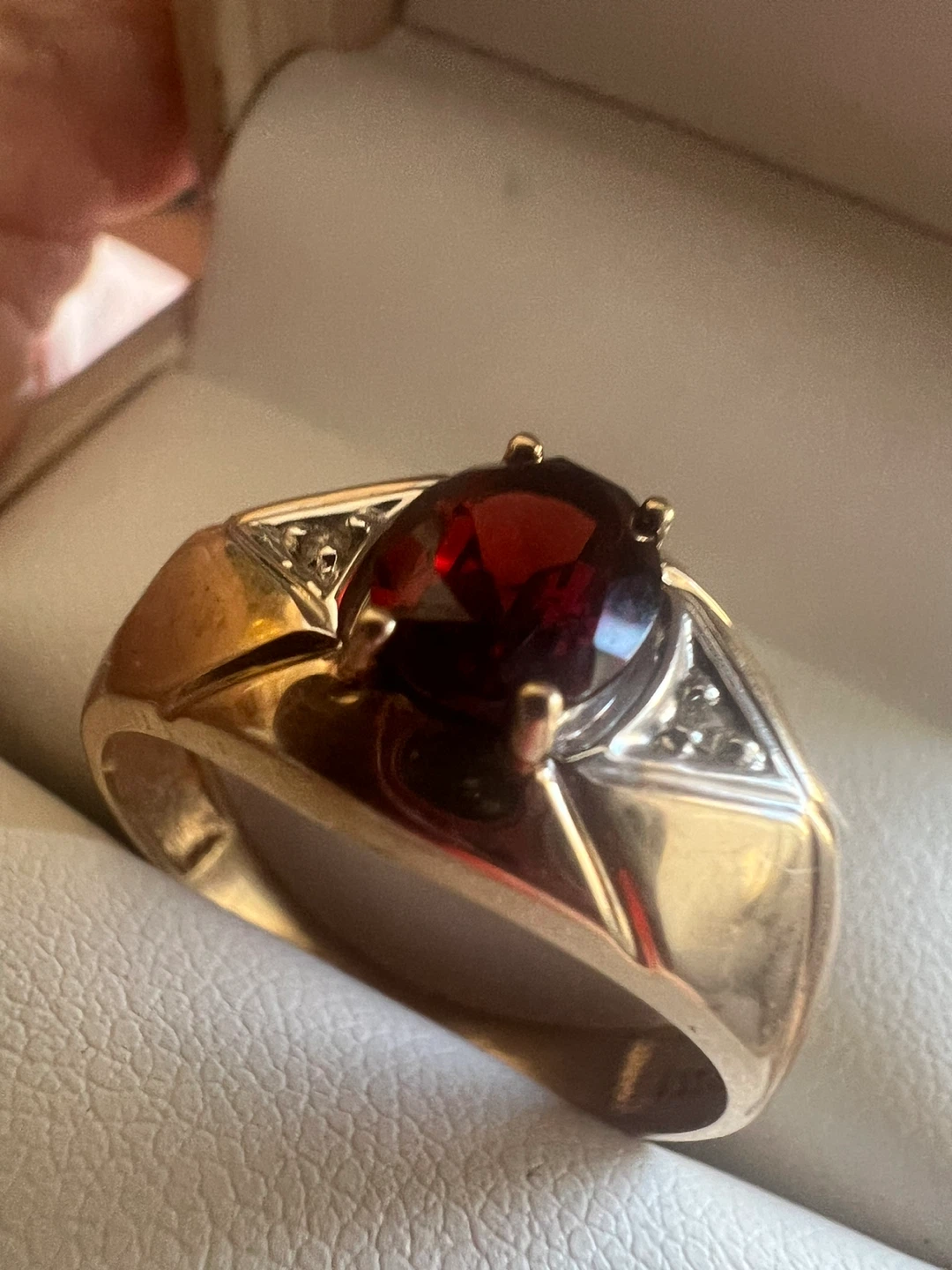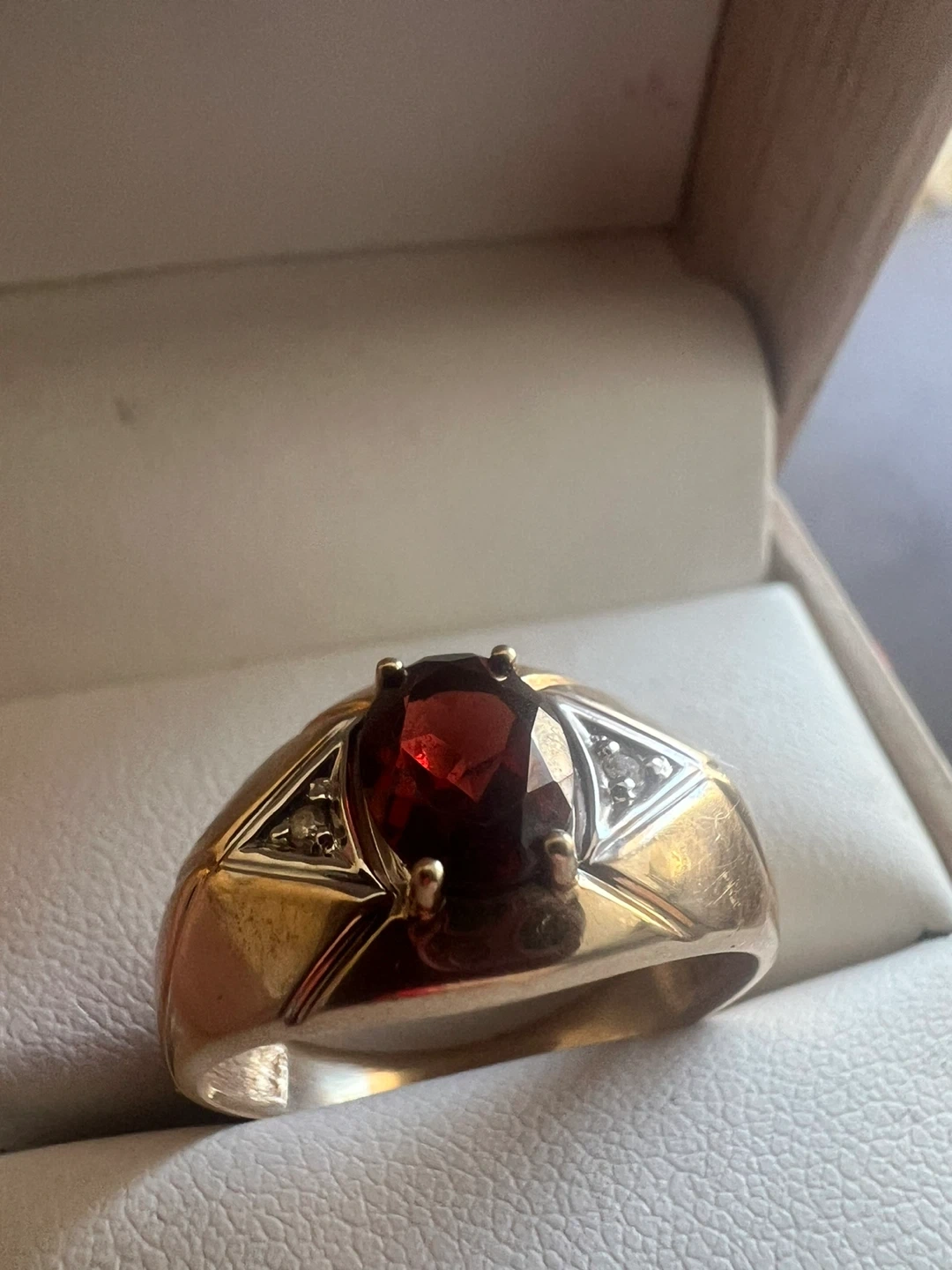 This is 10 k men's gold ring featuring a large oval garnet and two small diamonds on each side. The band is gold with a polished finish. It's set in a classic style.