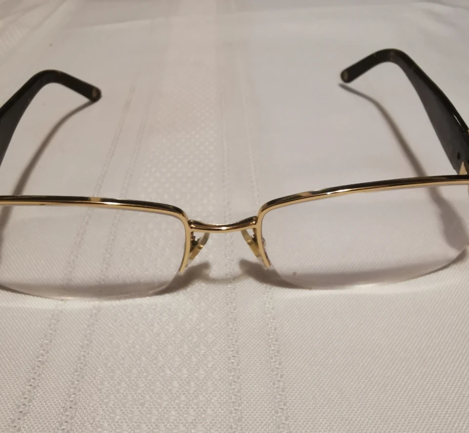Gently worn for a month prescription glasses. They are genuine and very beautiful. Gold tone with a light brownish frame. Original case with glasses
