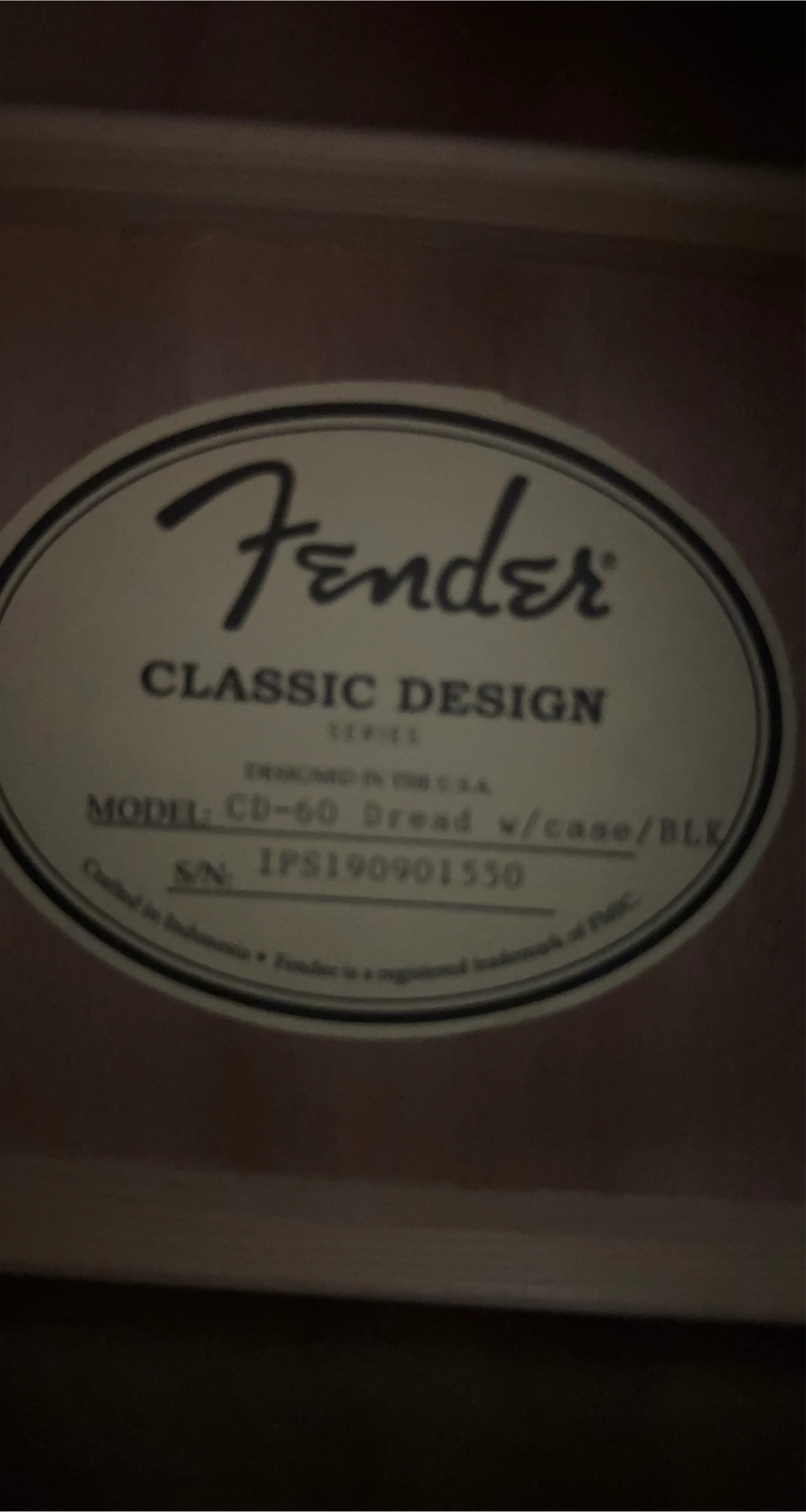 Fender CD-60 Dreadnought acoustic guitar in black. Comes with its original gig bag. Crafted in Indonesia. It has a very loud and warm sound so it’s great for both strumming and finger picking styles. If you have an electric acoustic guitar and willing to trade let me know