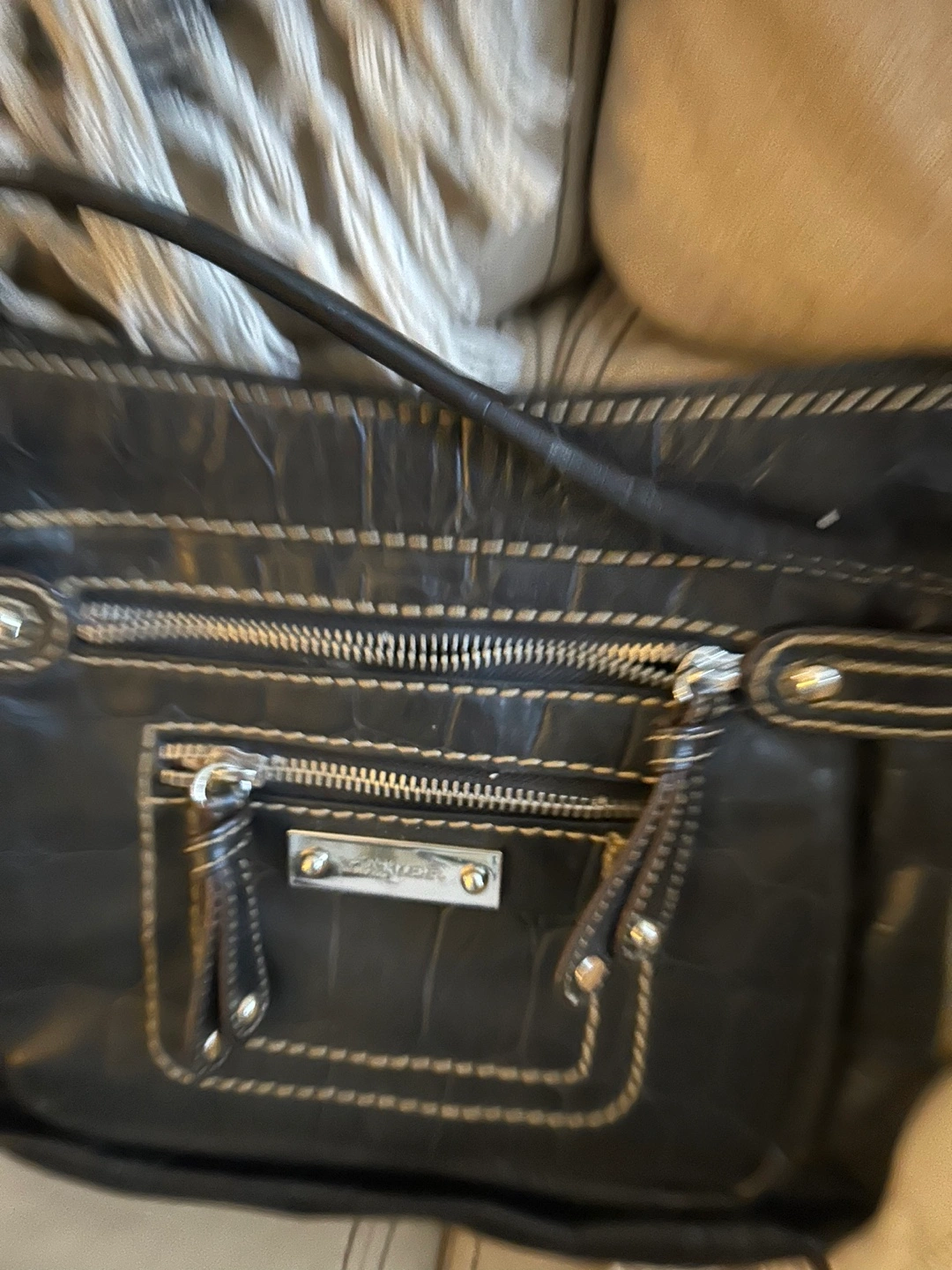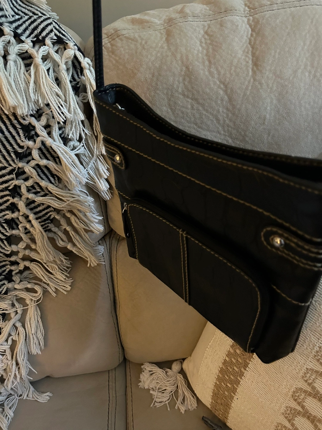 Black leather crossbody bag. Features multiple zippered compartments and an adjustable strap.