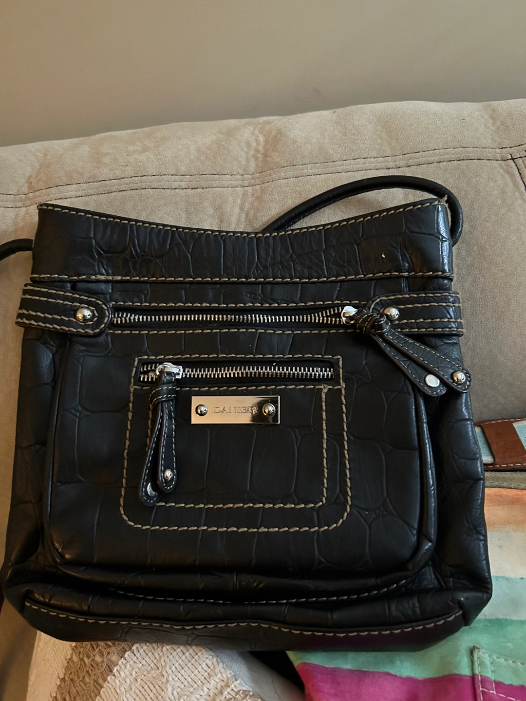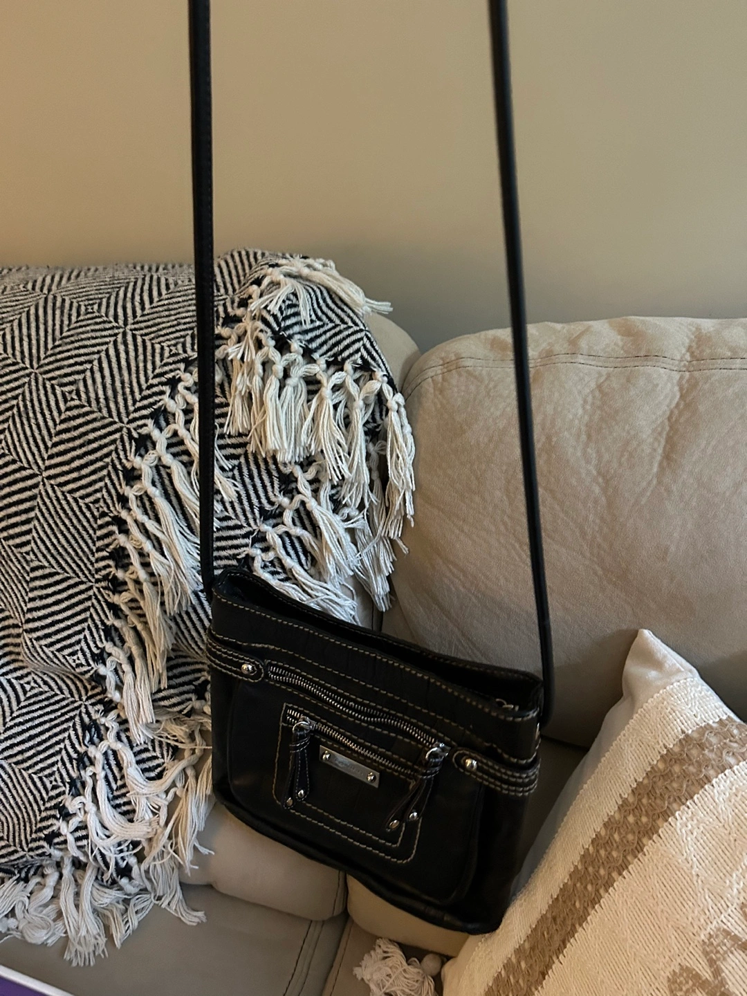 Black leather crossbody bag. Features multiple zippered compartments and an adjustable strap.