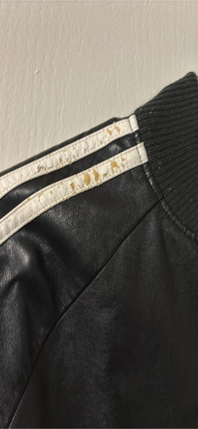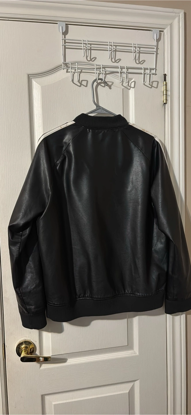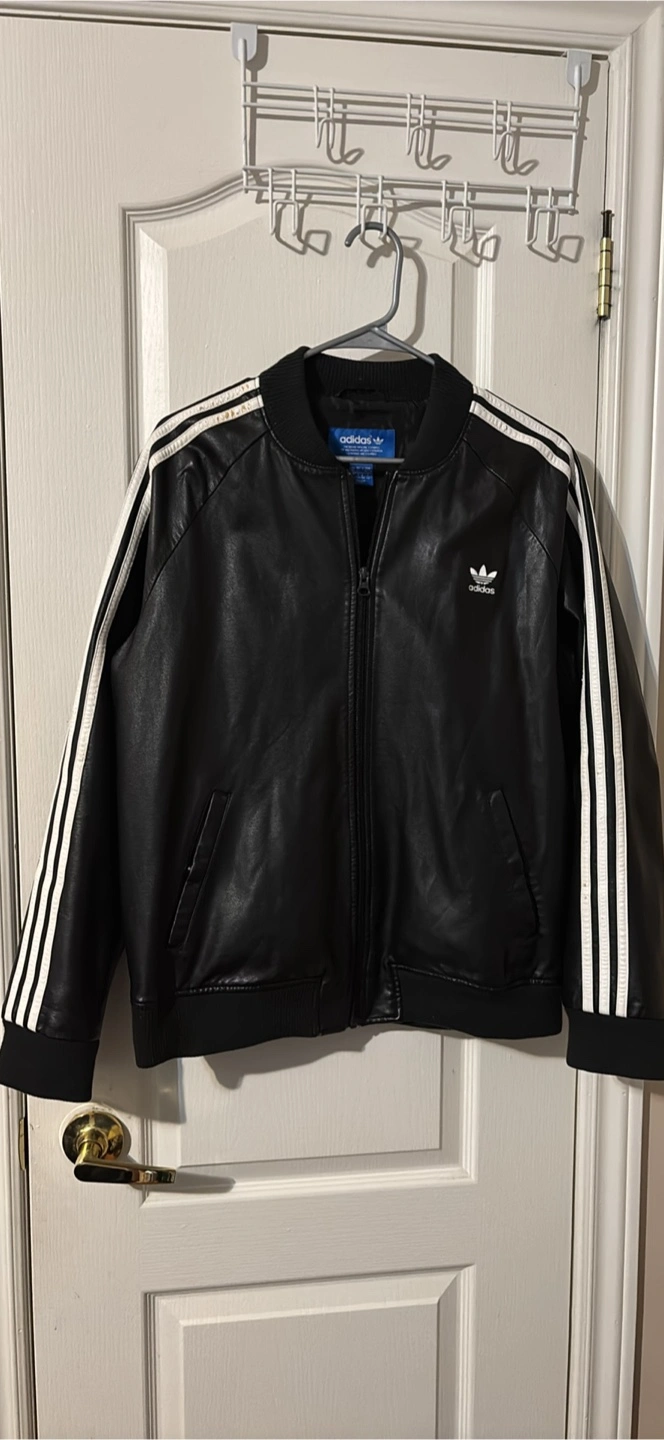 Selling an Adidas faux leather jacket in black. It features the classic three stripes on the sleeves. There are some marks on the stripes as shown in the pictures.