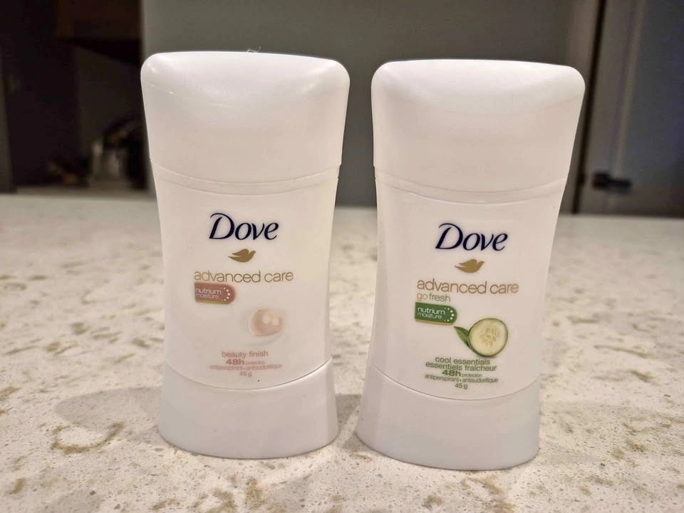 New Dove Advanced Care antiperspirant. Includes two sticks: one Beauty Finish and one Cool Essentials Go Fresh. Both are 45g and provide 48-hour protection.