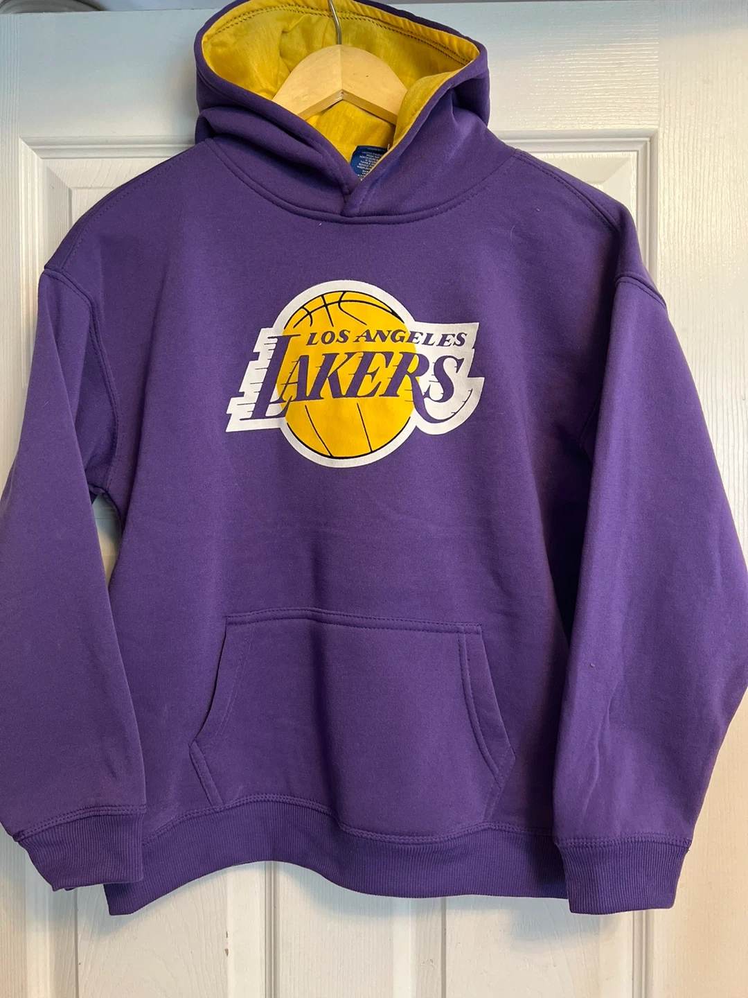 This is a Los Angeles Lakers purple hooded sweatshirt. It features the team's logo prominently on the front. It has a front kangaroo pocket and a yellow-lined hood. Size 14-16 youth.