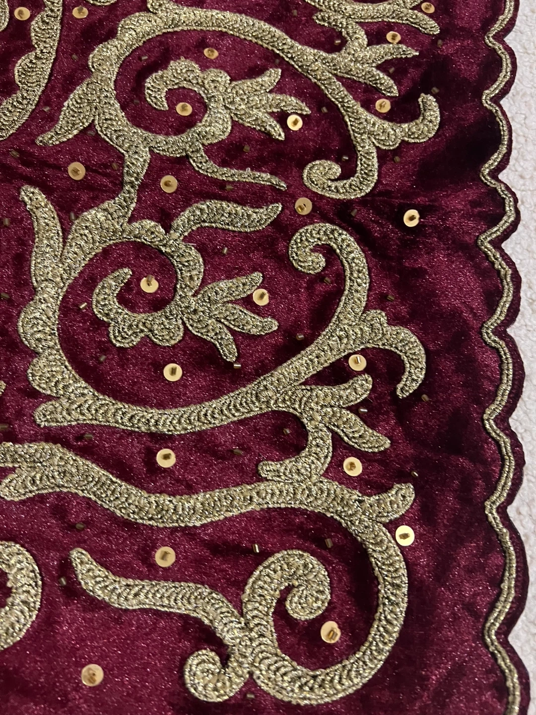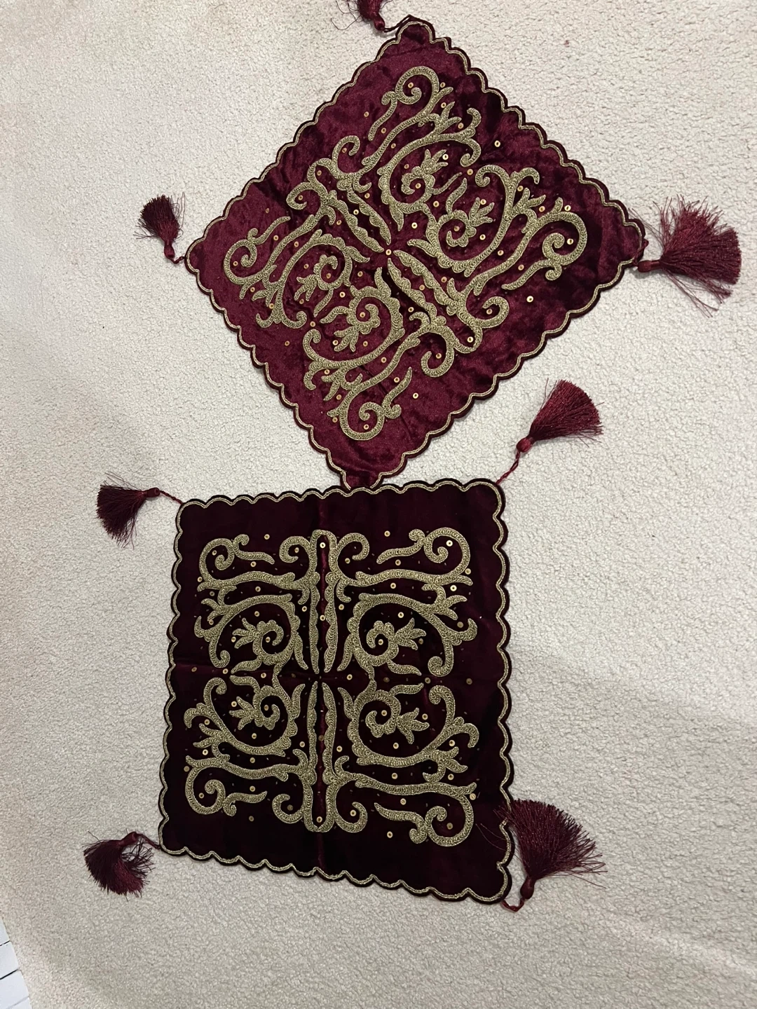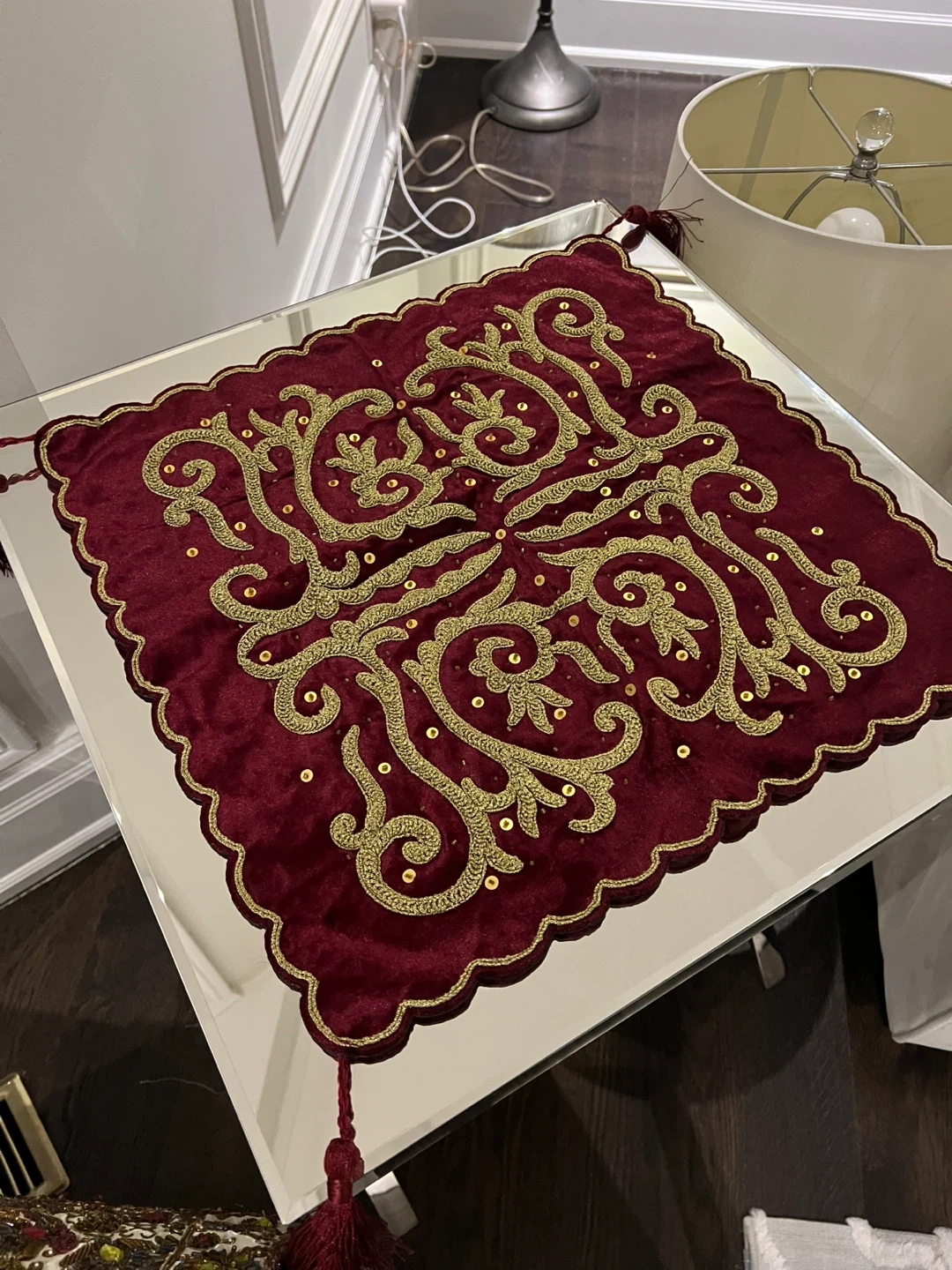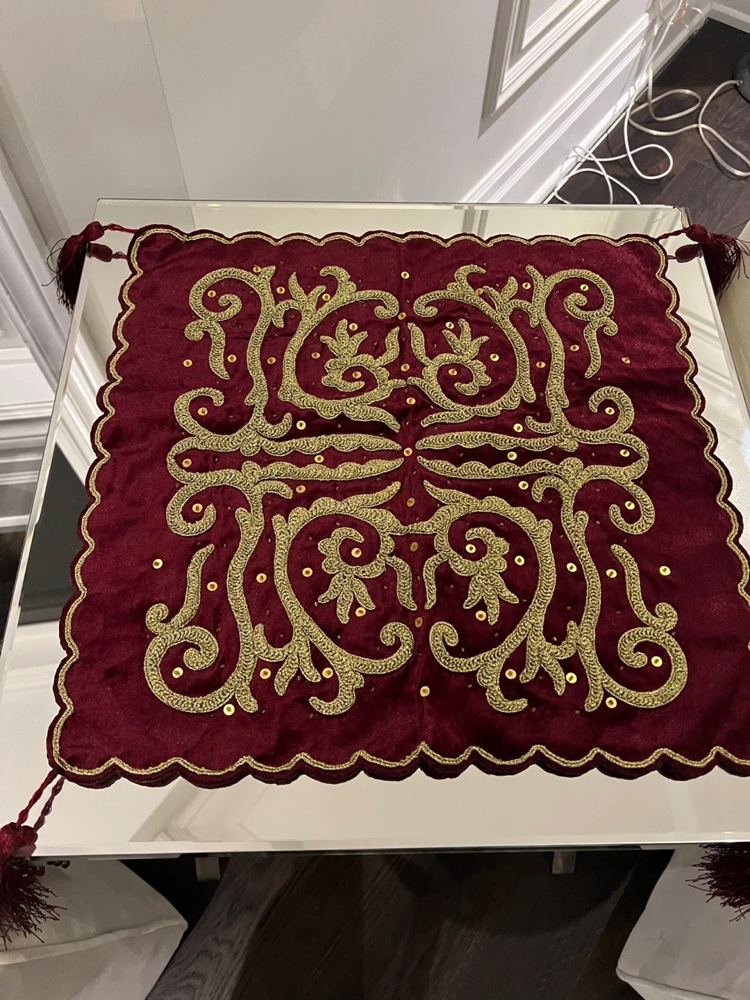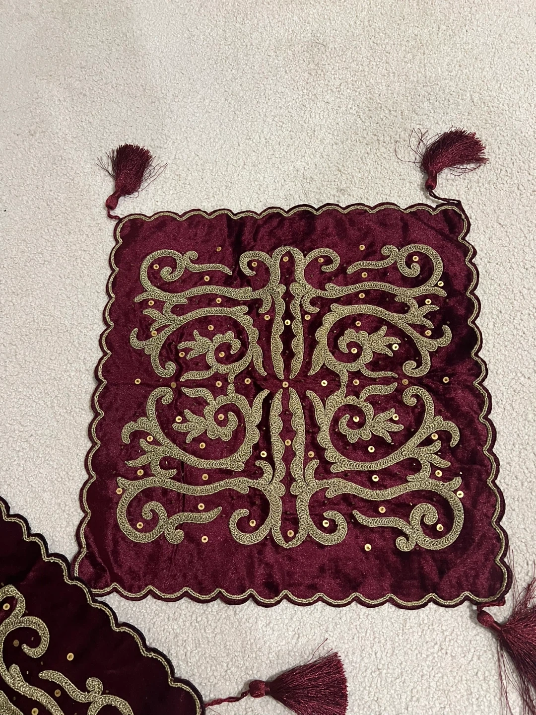 This is a lovely decorative table topper, featuring a rich burgundy velvet material and intricate gold embroidery. It has tassels on each corner and a scalloped edge. Adds a touch of elegance to any table!