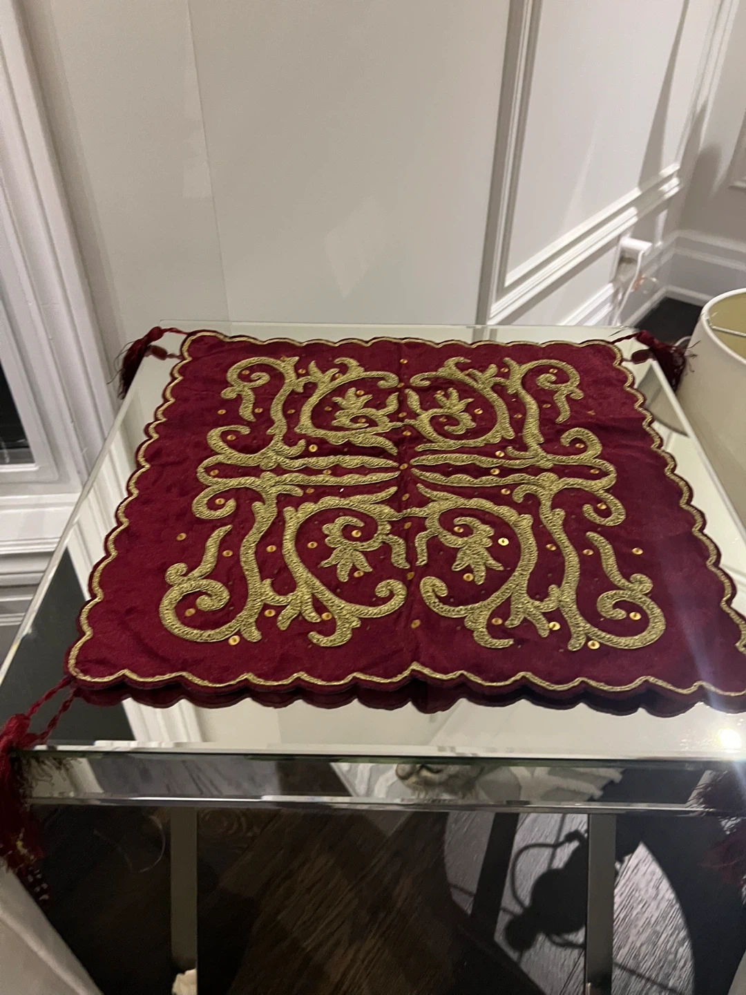 This is a lovely decorative table topper, featuring a rich burgundy velvet material and intricate gold embroidery. It has tassels on each corner and a scalloped edge. Adds a touch of elegance to any table!