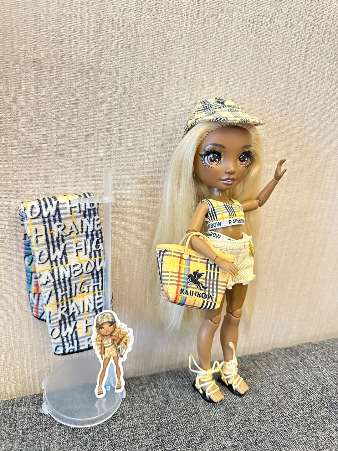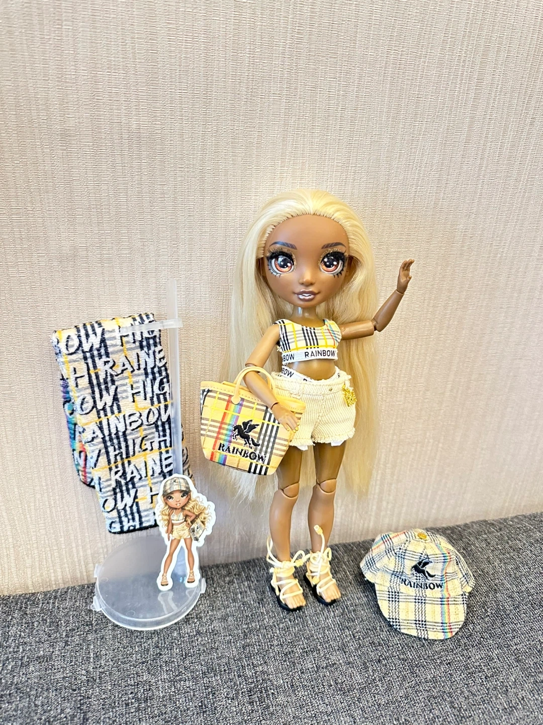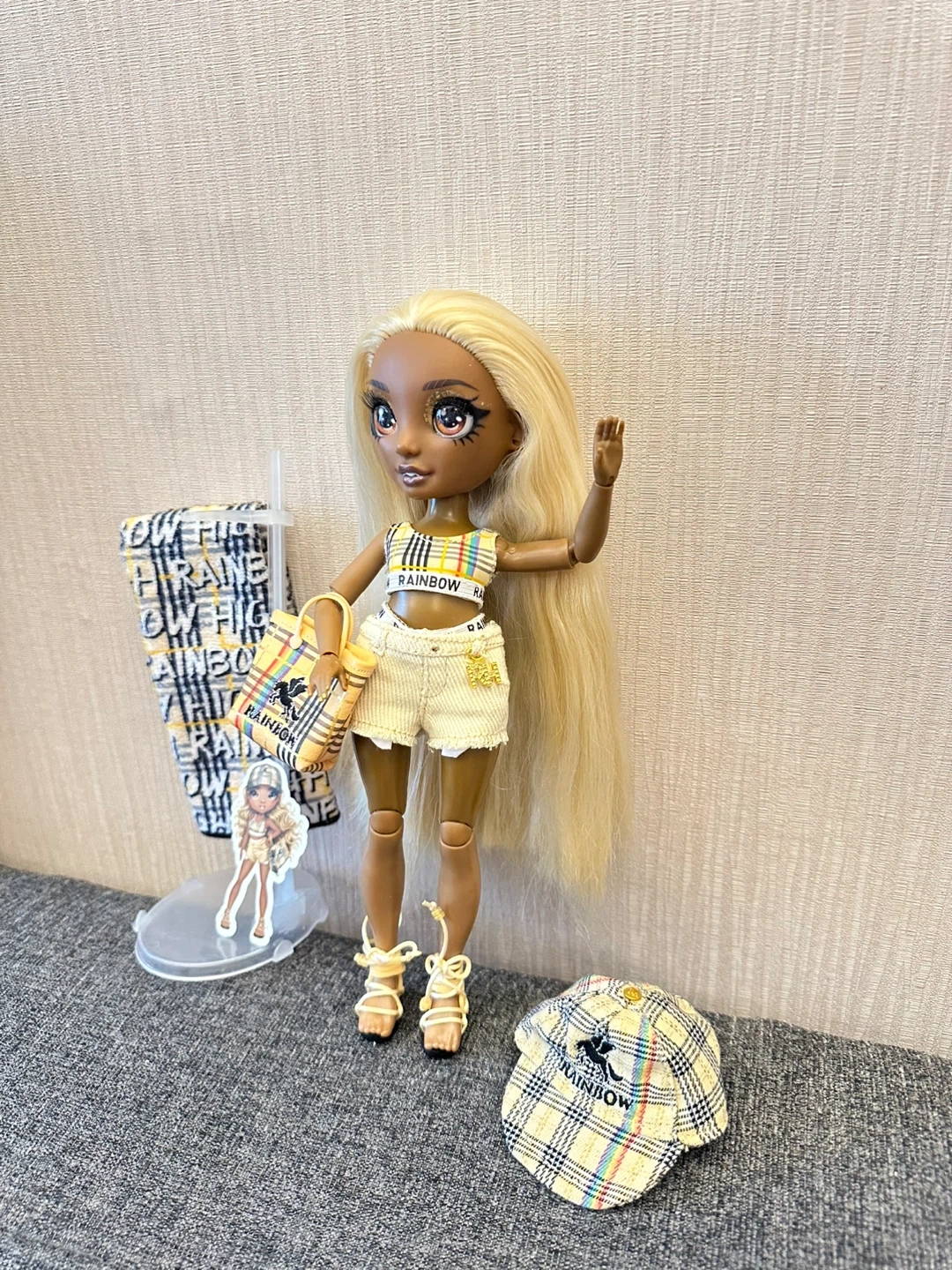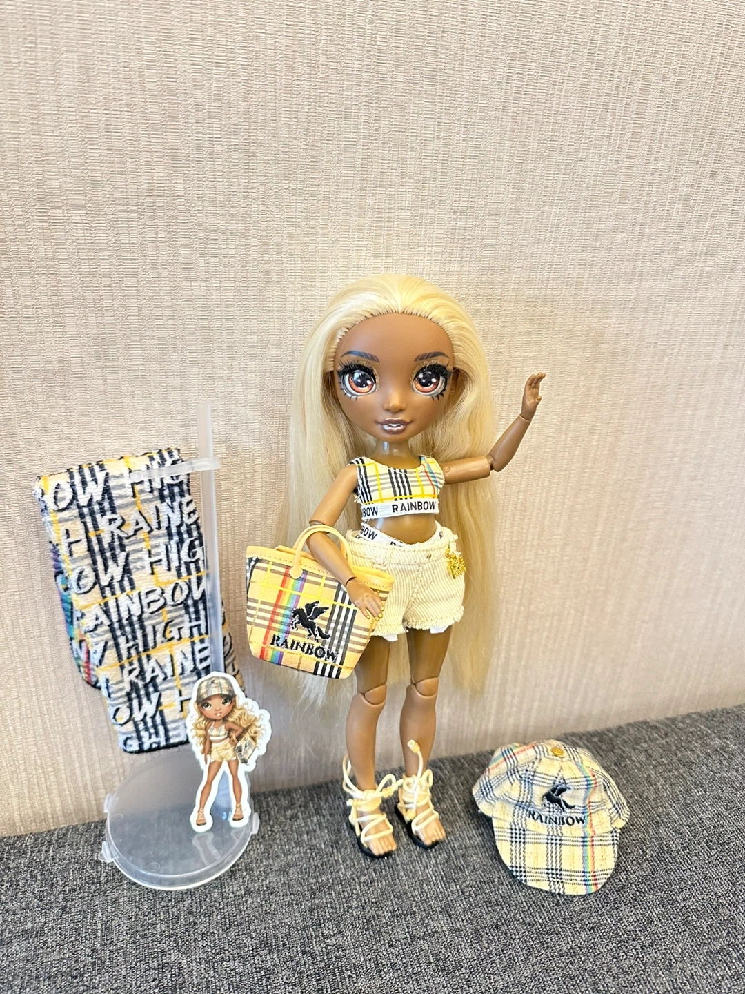 This Rainbow High doll is ready for a day out. It's dressed in a yellow plaid outfit with matching accessories. Includes a purse, hat, and other items.