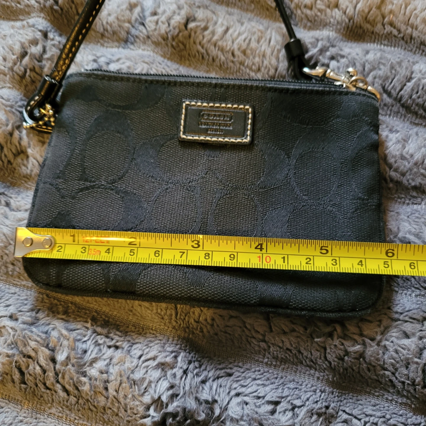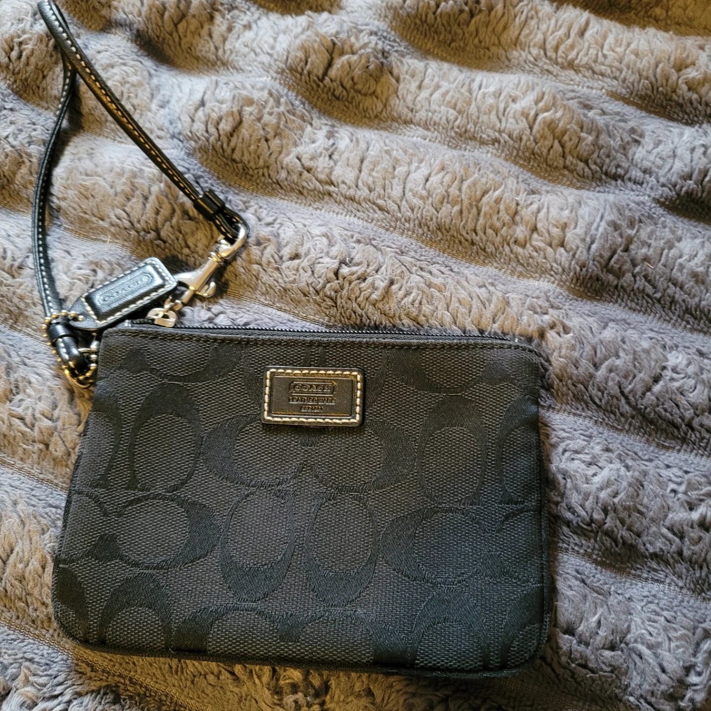 Coach black signature C pattern wristlet pouch. Includes original leather hang tag and detachable wrist strap. Fabric interior. Measures approximately 6" wide by 4" tall.