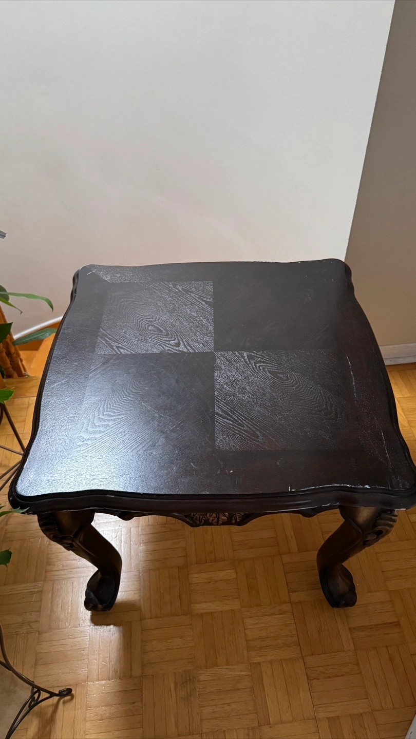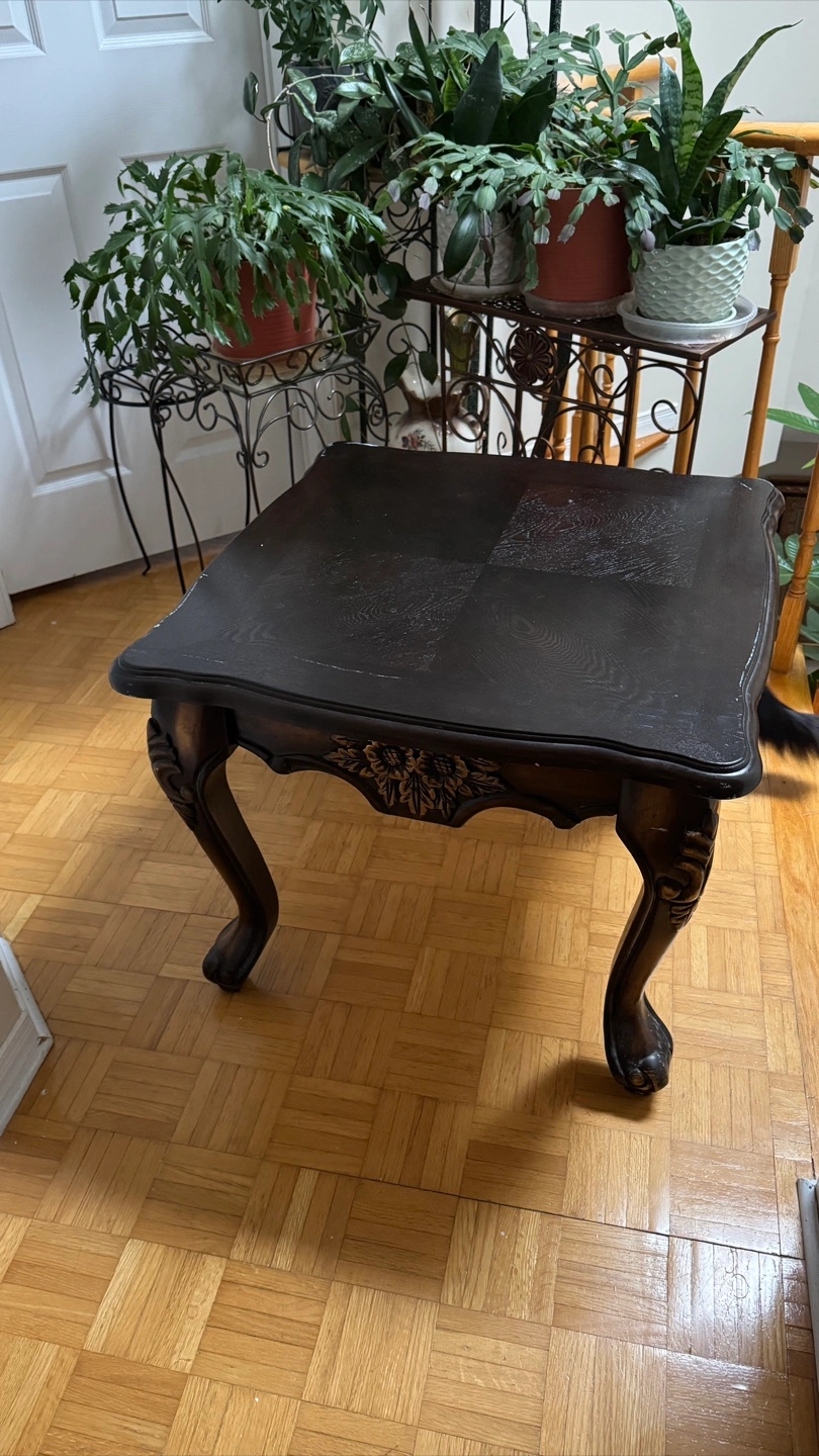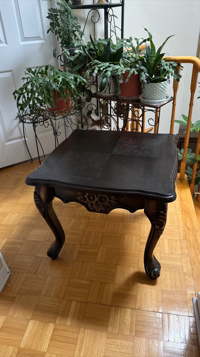 Selling a dark brown wooden side table. It has a classic design with ornate legs and a decorative floral detail along the edge. Perfect for adding a touch of elegance to any room!