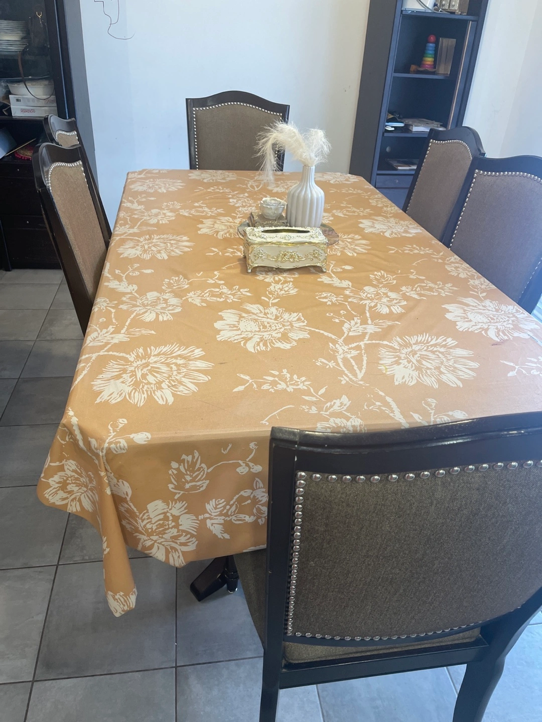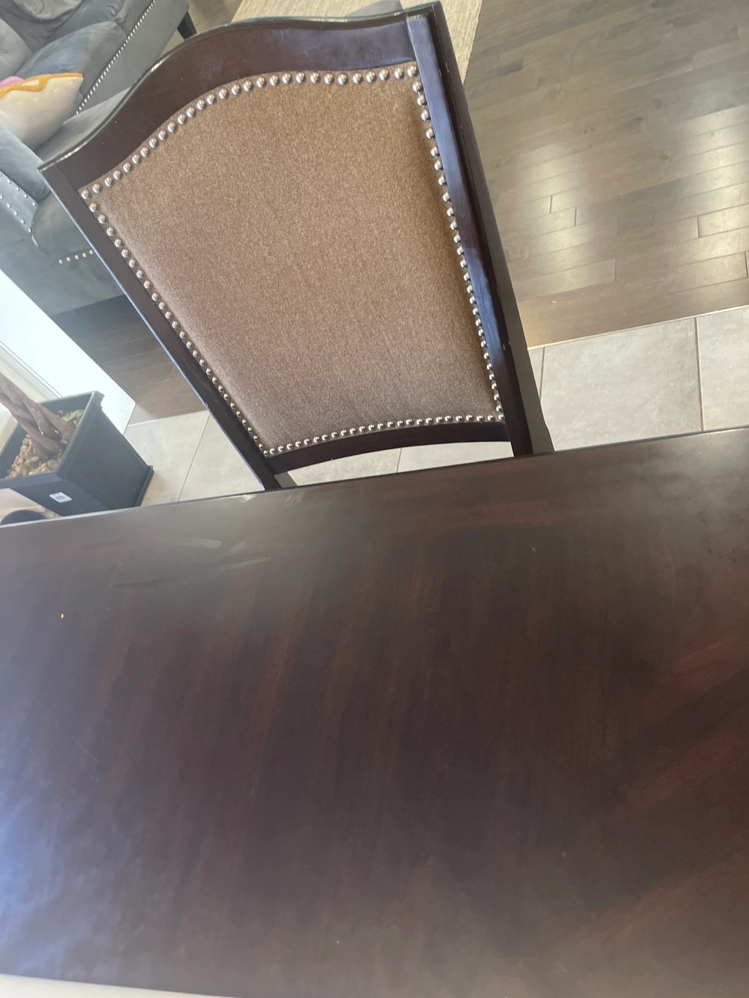 Six-piece dining set, includes one rectangular table and six chairs. Dark brown finish. Upholstered chairs with nailhead trim. Tabletop shows minor wear. Excellent for everyday use.