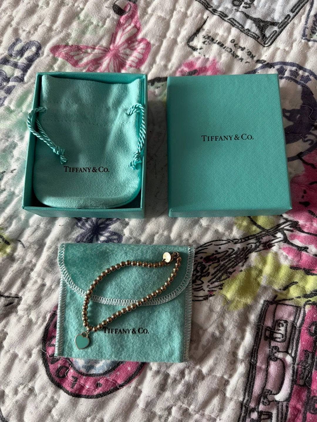 A beautiful Tiffany & Co. bracelet featuring small beads and a signature heart charm. It comes with its original Tiffany & Co. box and pouch. This classic piece adds a touch of elegance to any outfit.