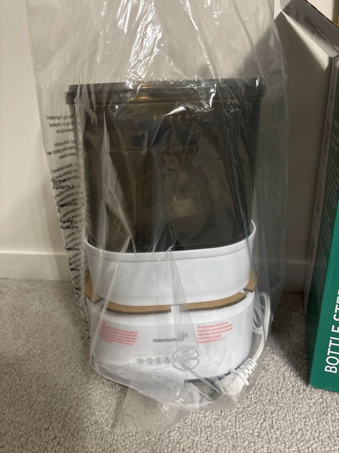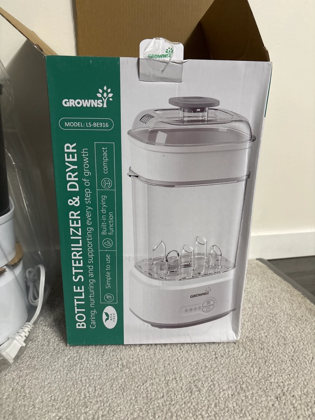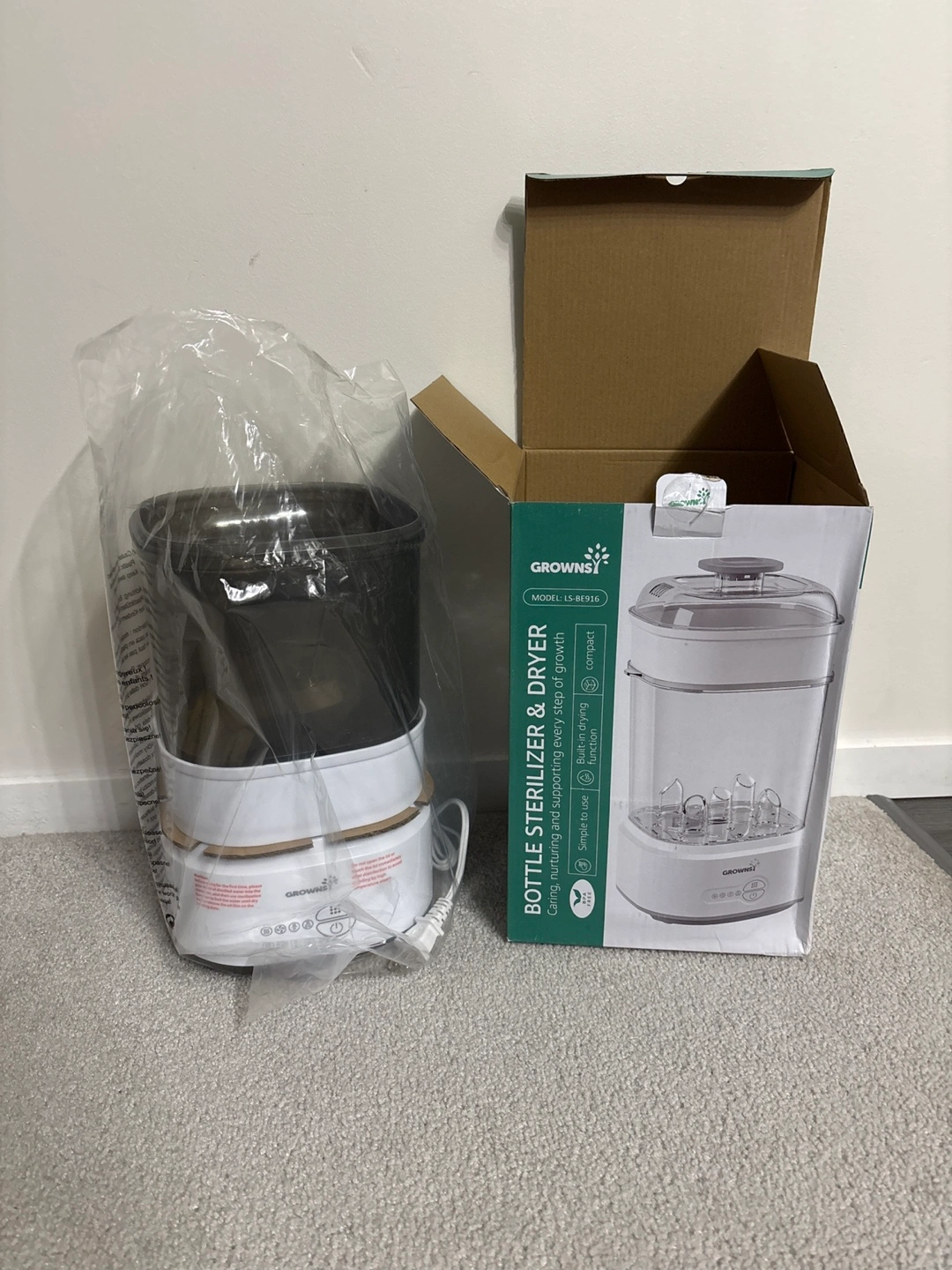 New Grownsi bottle sterilizer and dryer. Compact design. Includes built-in drying function. Simple to use. Sterilizes and dries baby bottles. Retails on Amazon for 89.99 NEVER USED opened for pictures .