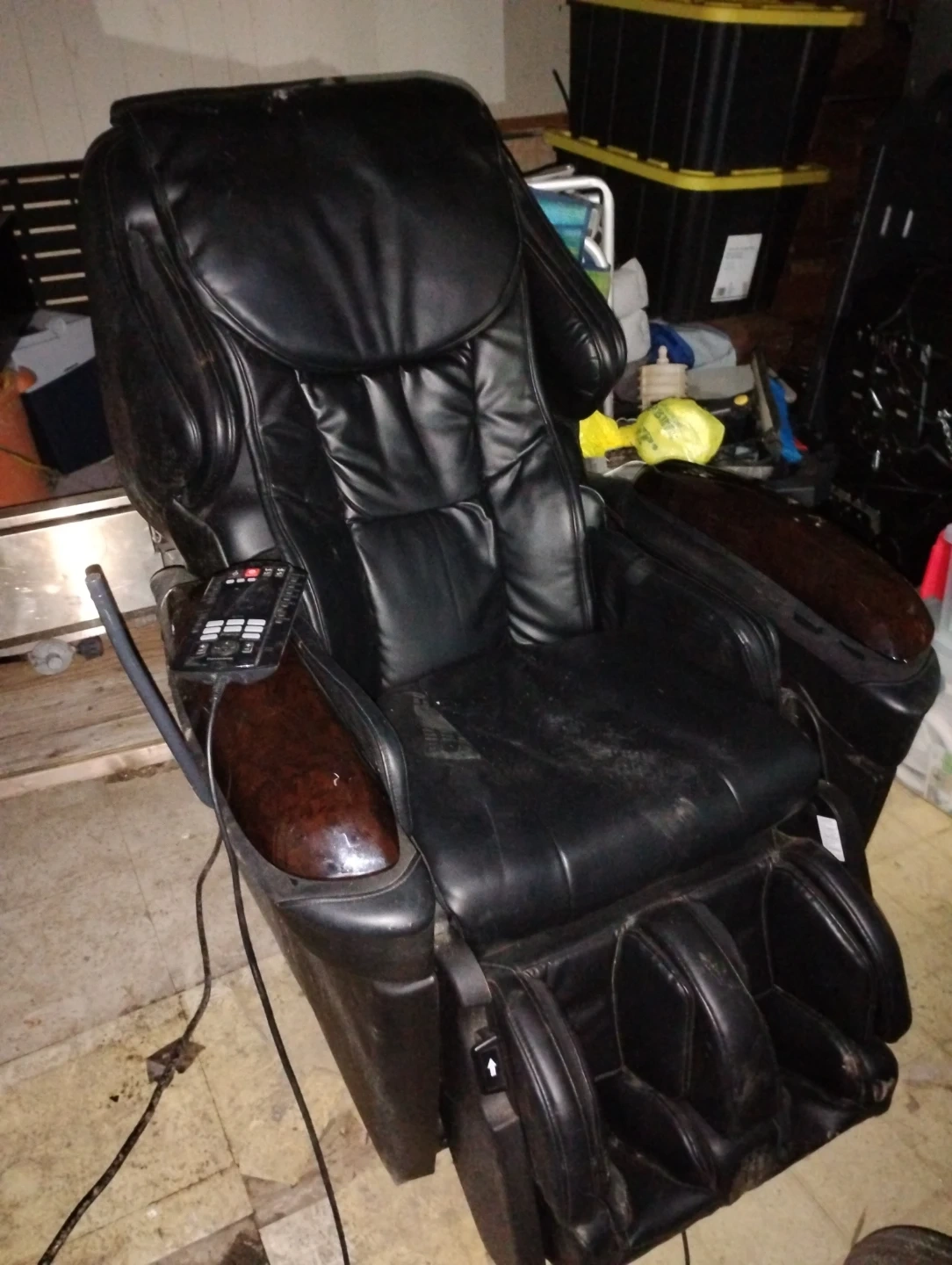 This is a black leather massage chair. It comes with a remote control for various settings. The chair features adjustable full body massage options ,.omg, better than sex!