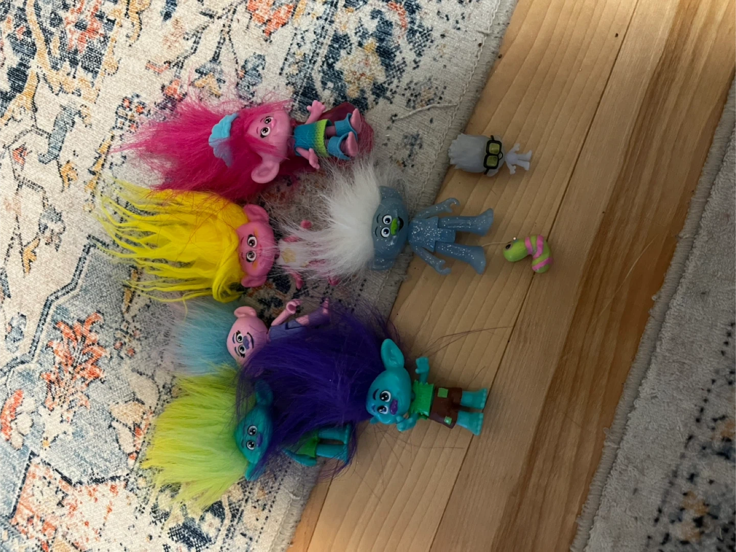 A collection of small Trolls figures with colourful hair. Includes a small green creature accessory. These toys are great for imaginative play. I have Bruce too. I’ll make sure to pop him in the bag.