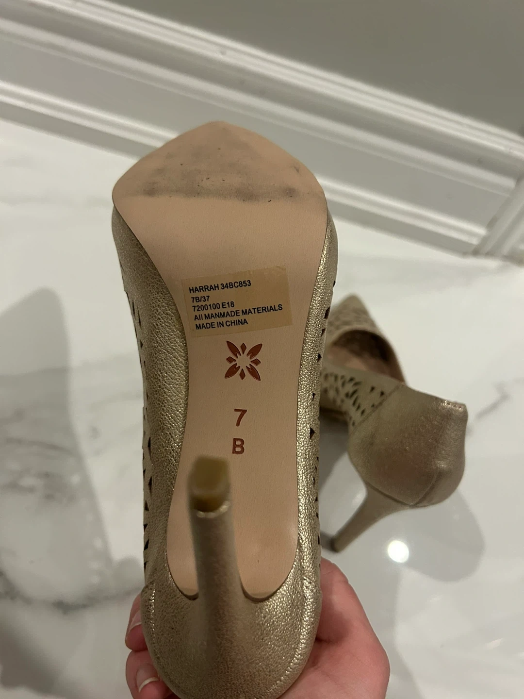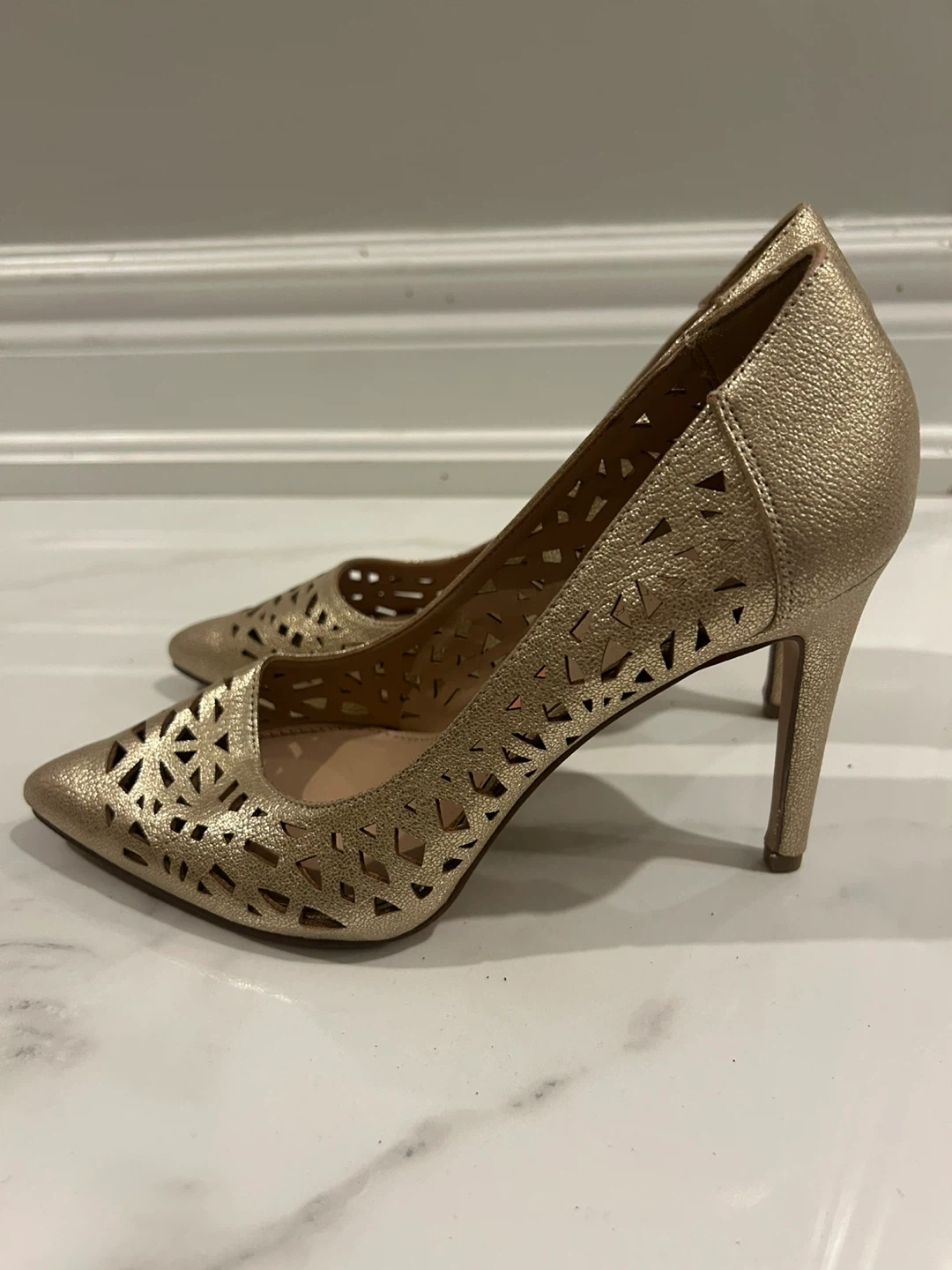 Selling a pair of BCBGeneration gold heels in size 7. They have a stylish, laser-cut design. The style name is Harrah. They are made of manmade materials.