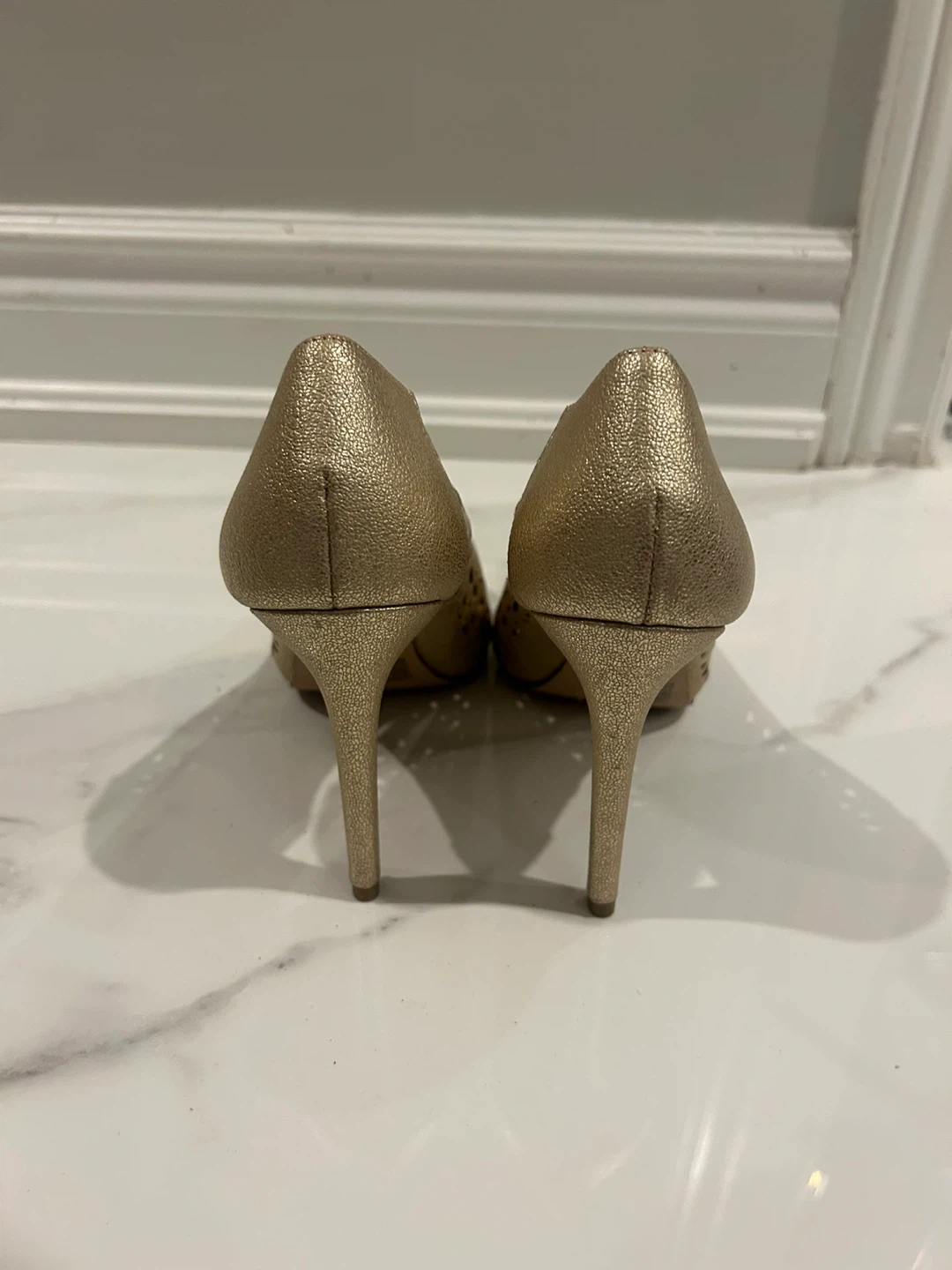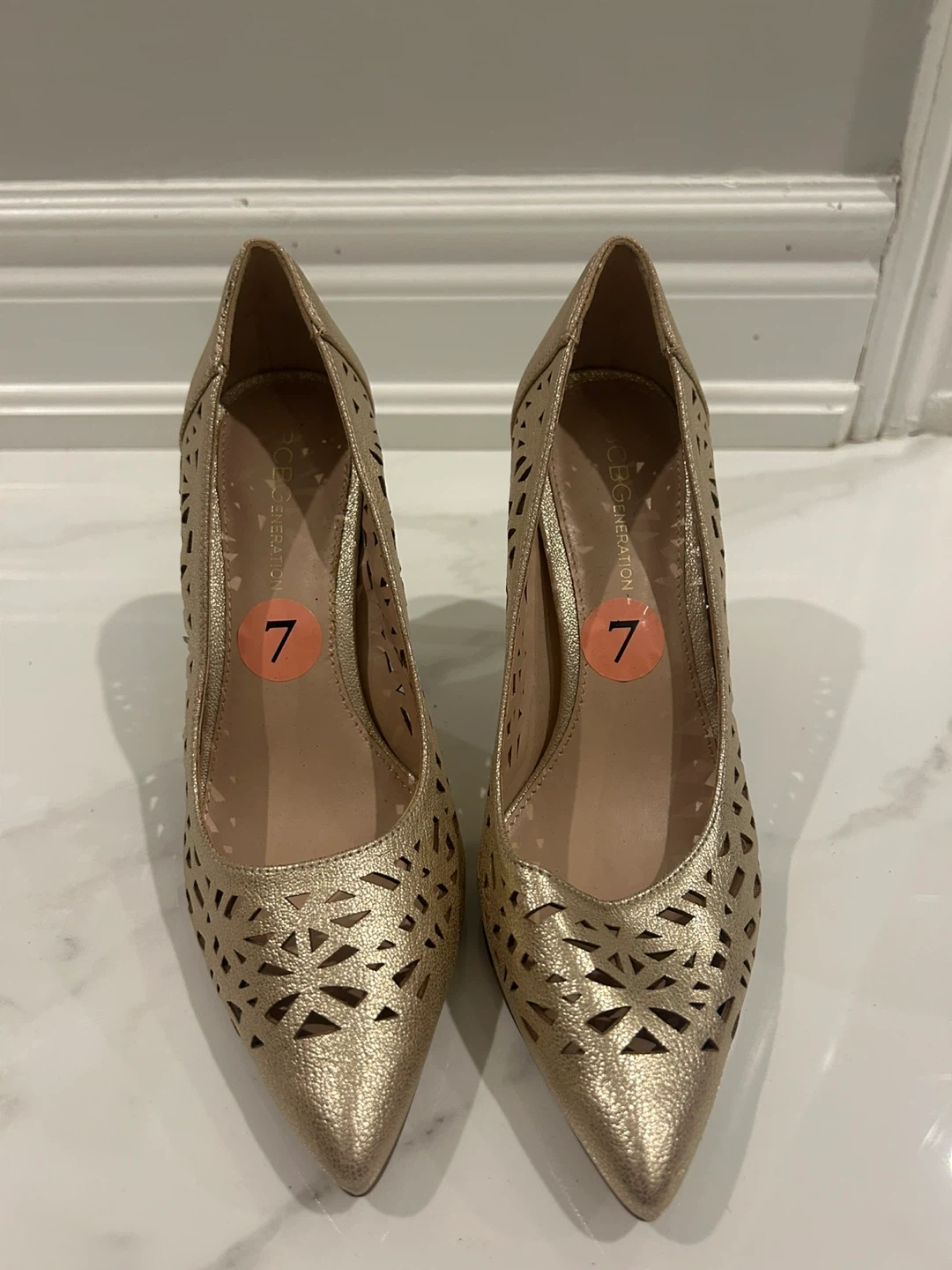 Selling a pair of BCBGeneration gold heels in size 7. They have a stylish, laser-cut design. The style name is Harrah. They are made of manmade materials.