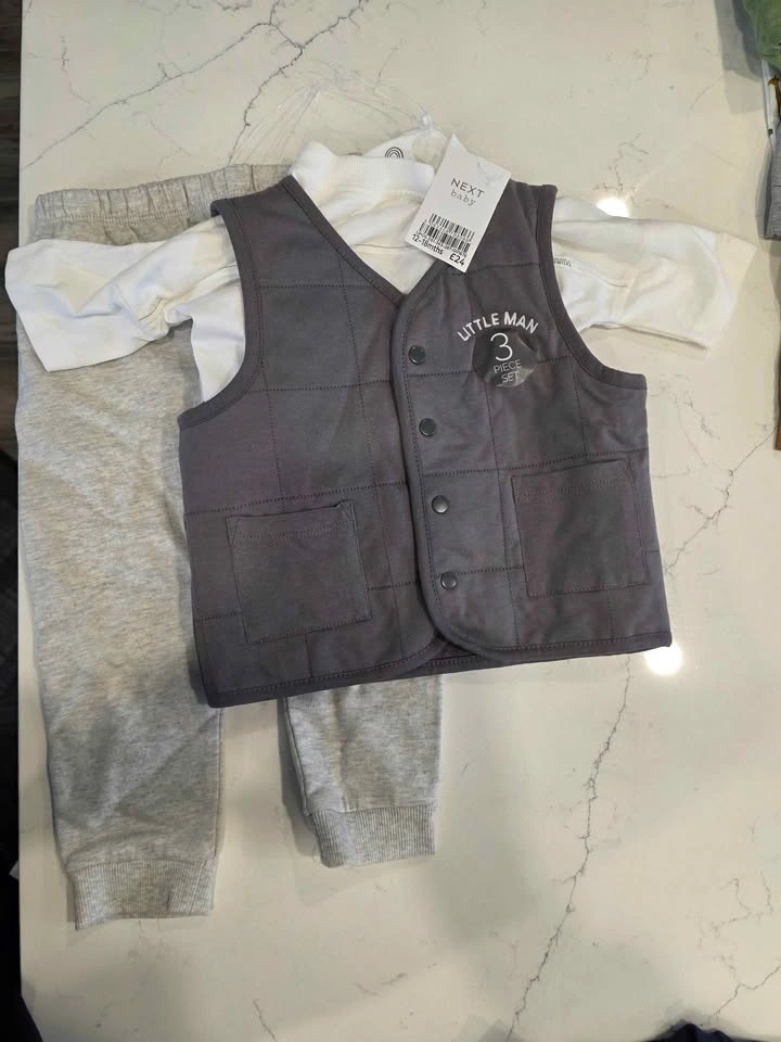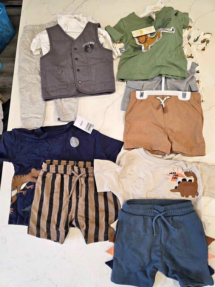 Brand new baby boy clothing bundle (12-18 months), all 3 complete outfit sets with tags. Includes: 2 premium NEXT 4-piece outfits (multiple tops and shorts included), 1 adorable 3-piece formal set (vest, shirt, pants). Perfect ready-to-wear outfits — great for everyday or special occasions. Retail value over $100. Smoke-free, pet-free home. Pickup in Scarborough (Meadowvale and Ellesmere).