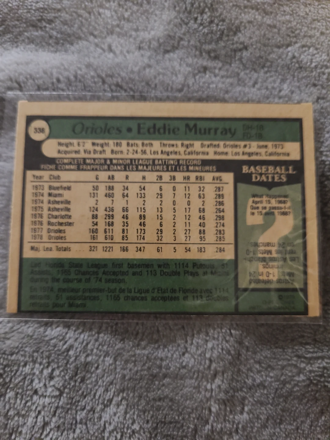 This is a 1979 O P Chee baseball card featuring Eddie Murray of the Orioles. He was acquired playing as a Designated Hitter and First Baseman. The card shows his career stats from 1973 to 1978.