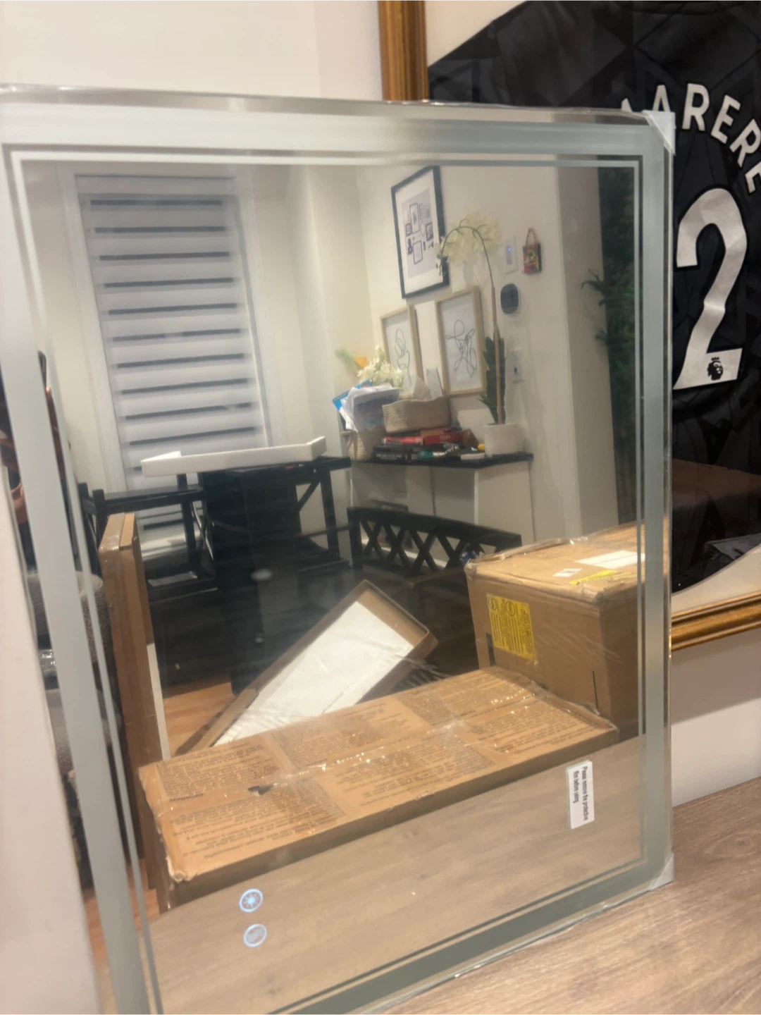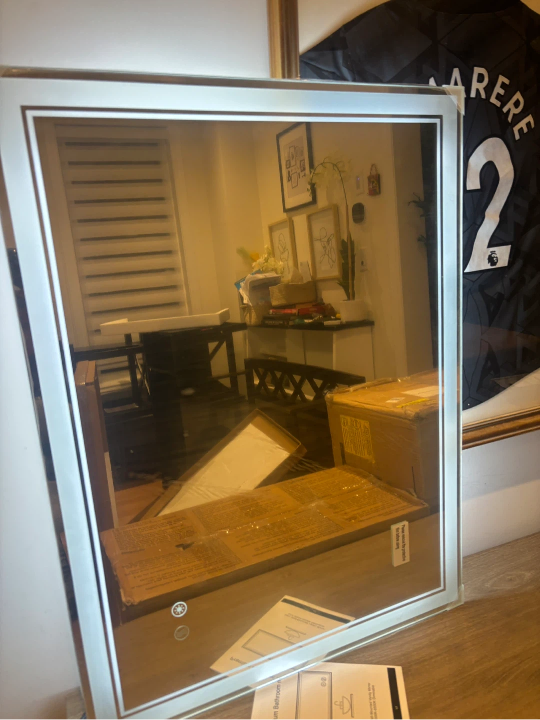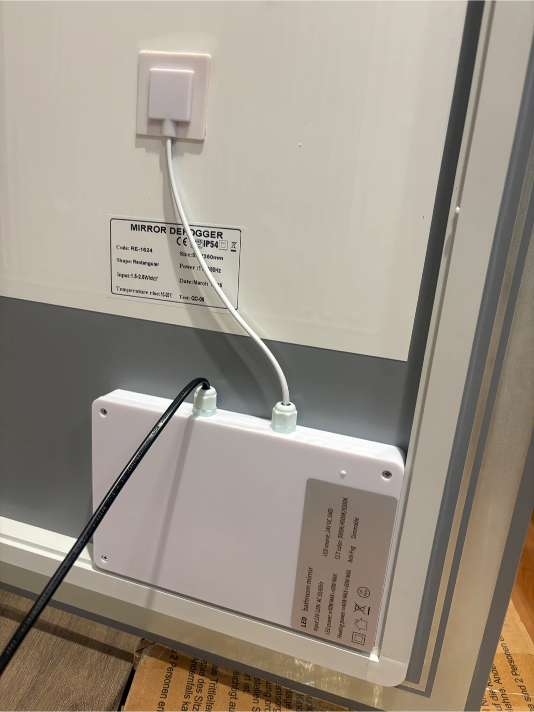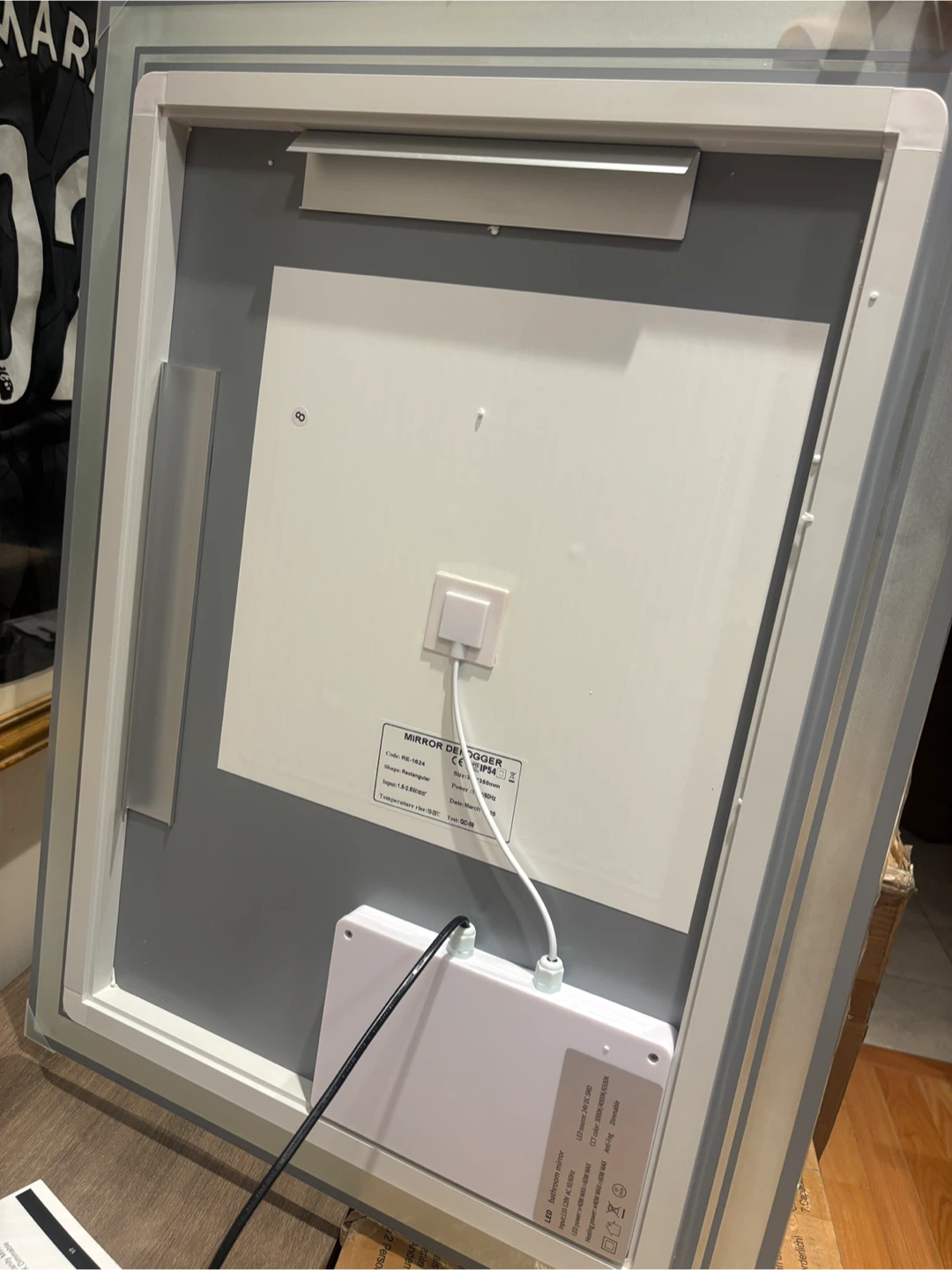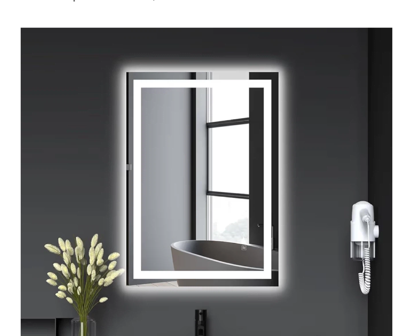 This is an LED bathroom mirror with a modern design. It features integrated lighting for a bright, clear reflection. It's suitable for any bathroom. Mountable as well. Heated function