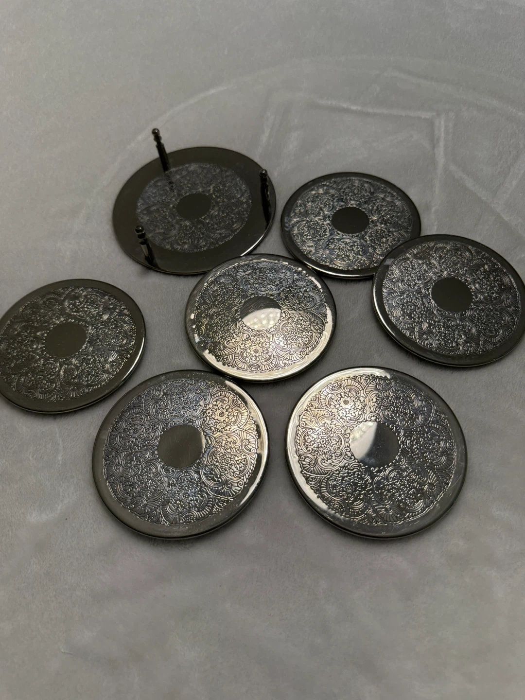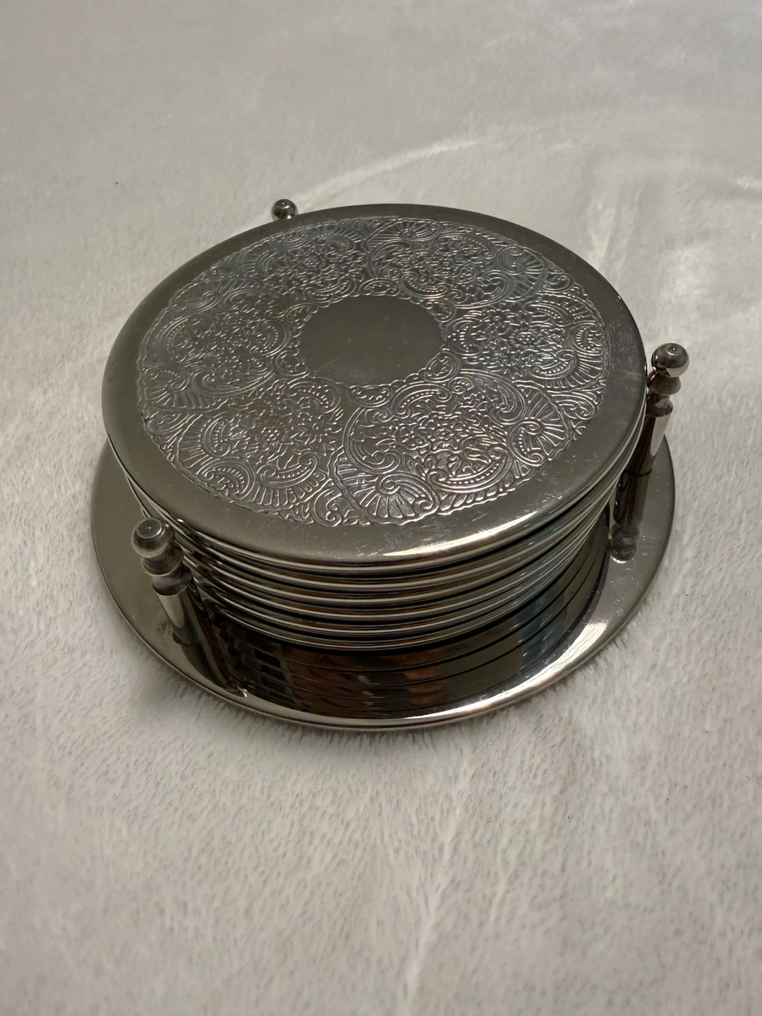 Here's a set of vintage silver-plated coasters with a matching holder. They have a beautiful, intricate floral design. Perfect for adding a touch of elegance to your home!