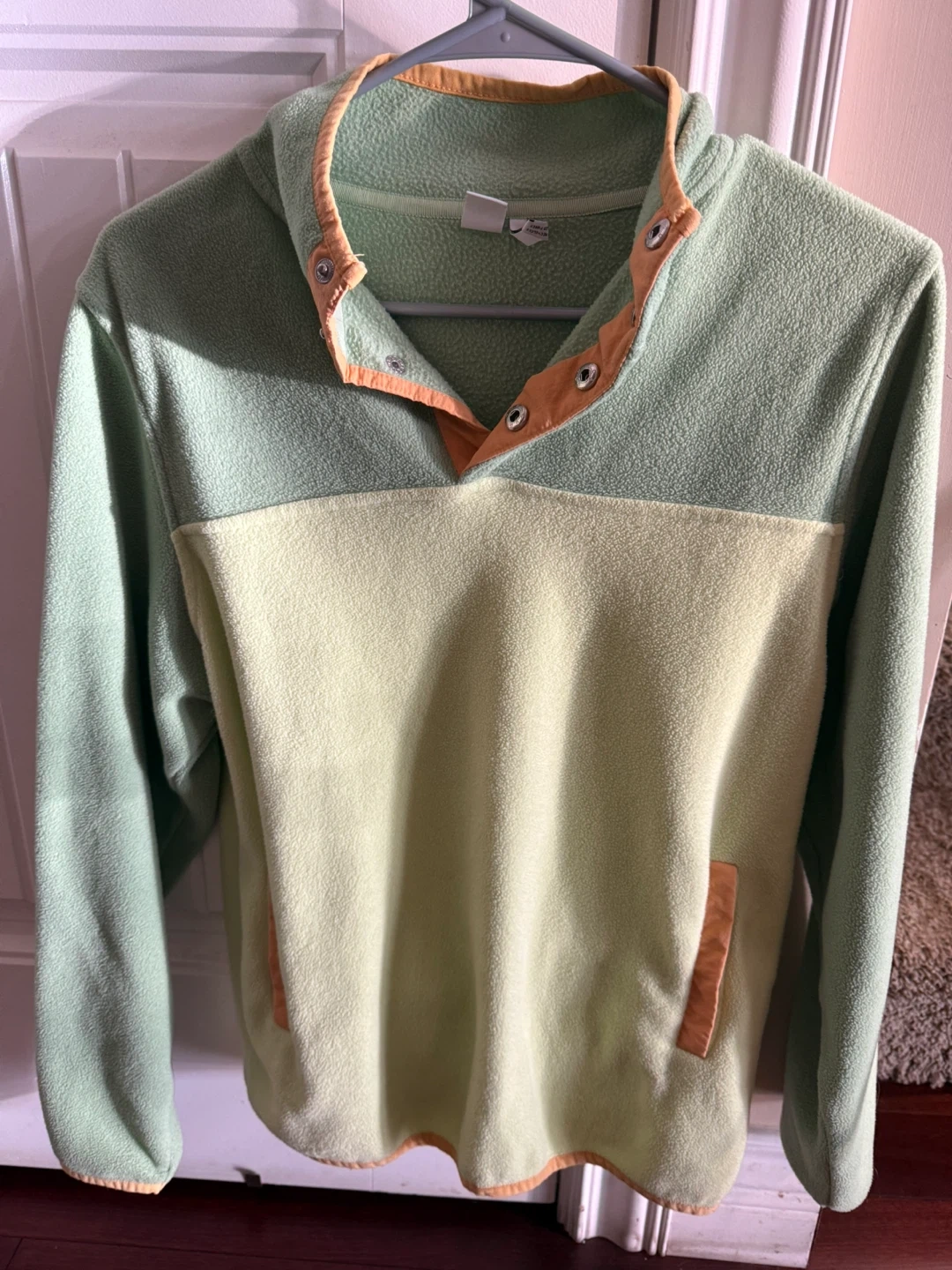 15Cozy Twik par Simons fleece pullover in a lovely green and yellow colour block design! It's a size P/S and features a unique button-up neckline and a handy front pocket. Perfect for staying warm and stylish on cooler days