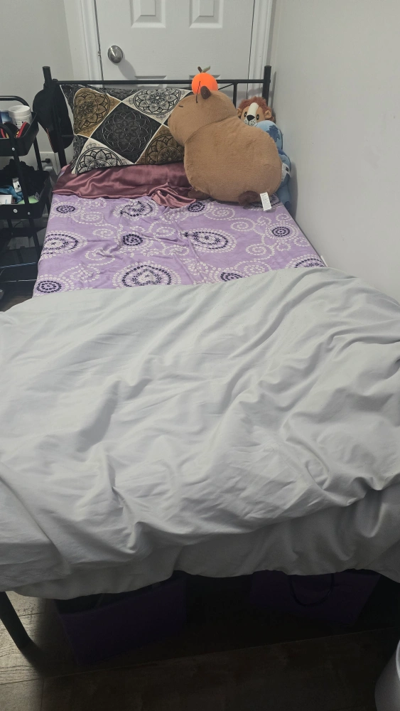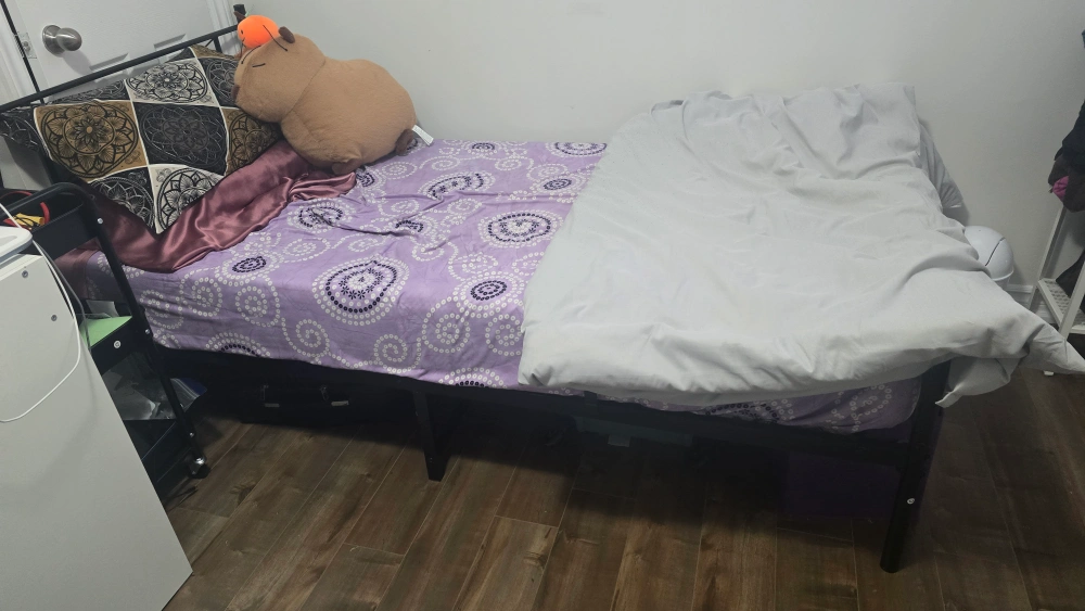 Selling a twin bed frame in good condition. It's sturdy and reliable, perfect for a bedroom or guest room. Ready for pick up! Used - like new bed frame and mattress Bed frame: Metal Bed Frame Mattress Foundation with Headboard,Steel Slat Support(Black, Twin) Mattress: Twin Mattress,8 Inch Gel Memorys Foam Mattress, Medium Firm