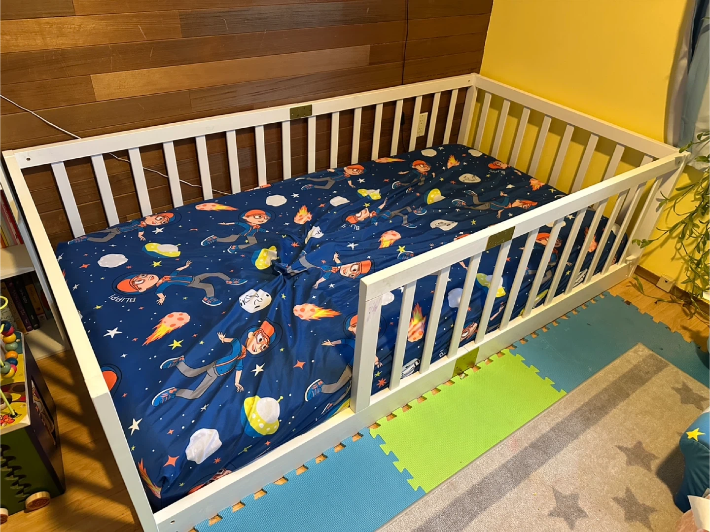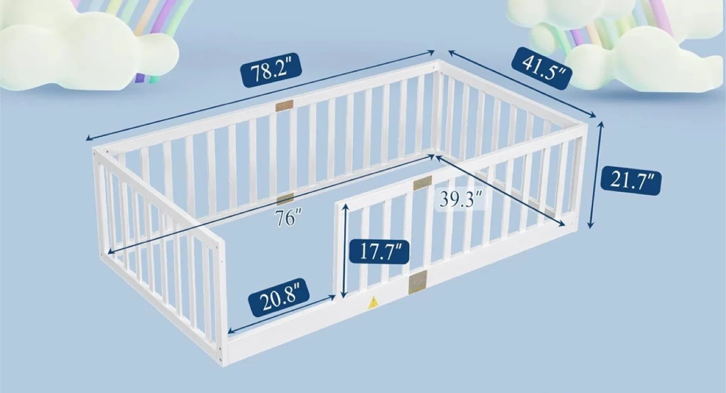 10Selling a twin floor bed with a fence. The dimensions are approximately 78.2" x 41.5" x 21.7". It also comes with assembly instructions. Perfect for a child's room! Asking $175 OBO My son used this bed for maybe a month or two and has gravitated to the bed in the other room so no longer need this one. It’s great for toddlers. The dimensions are in the pictures and the mattress is NOT included, need it for a new bed frame. The bed will be disassembled but I do have the assembly instructions to include with it. Comes from smoke free home.