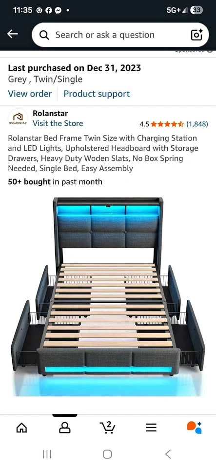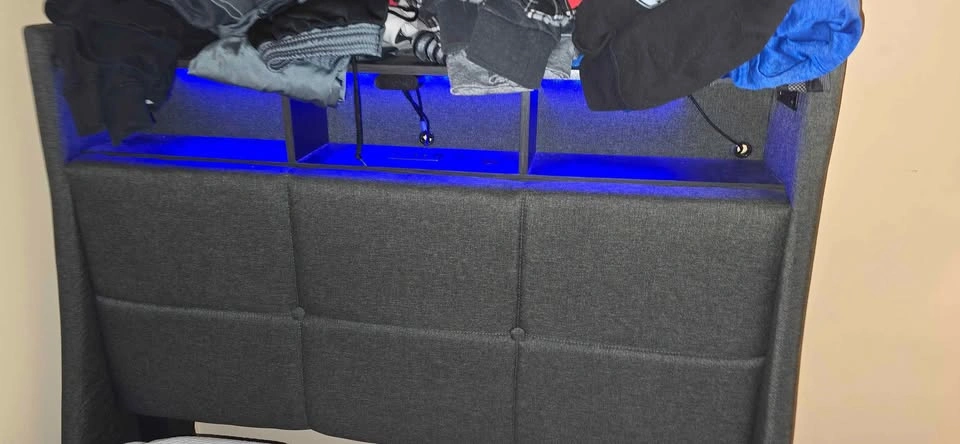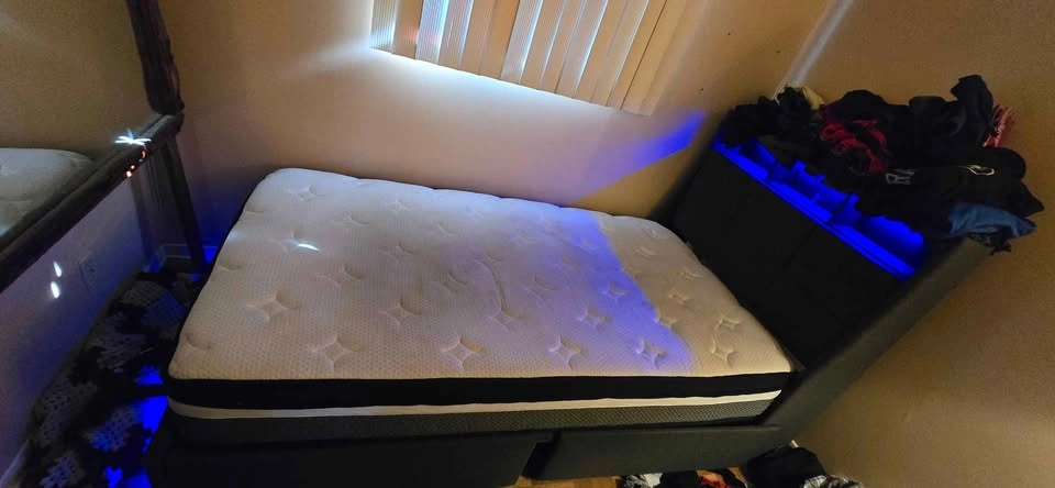 10Purchased on Amazon a twin pillow top mattress which my boys slept like babies. Lol. Twin bed frame has 4 drawers, a charging station in head board as shown in pictures, can support up to 900lbs and led lights on headboard and footboard and many colours to choose from. Mattress will be shampooed before selling no stains. Excellent condition. My boys have upgraded to Queen beds.