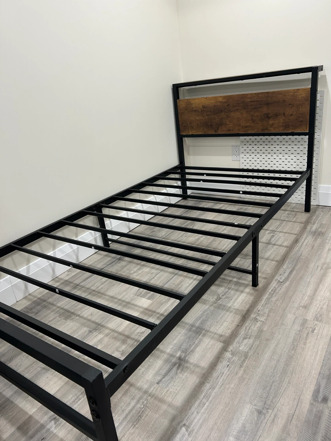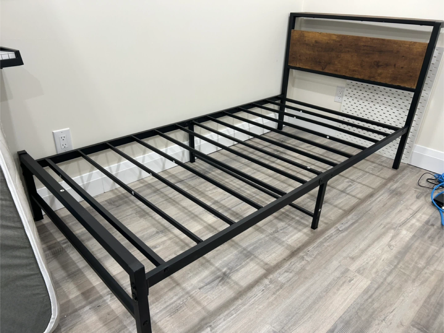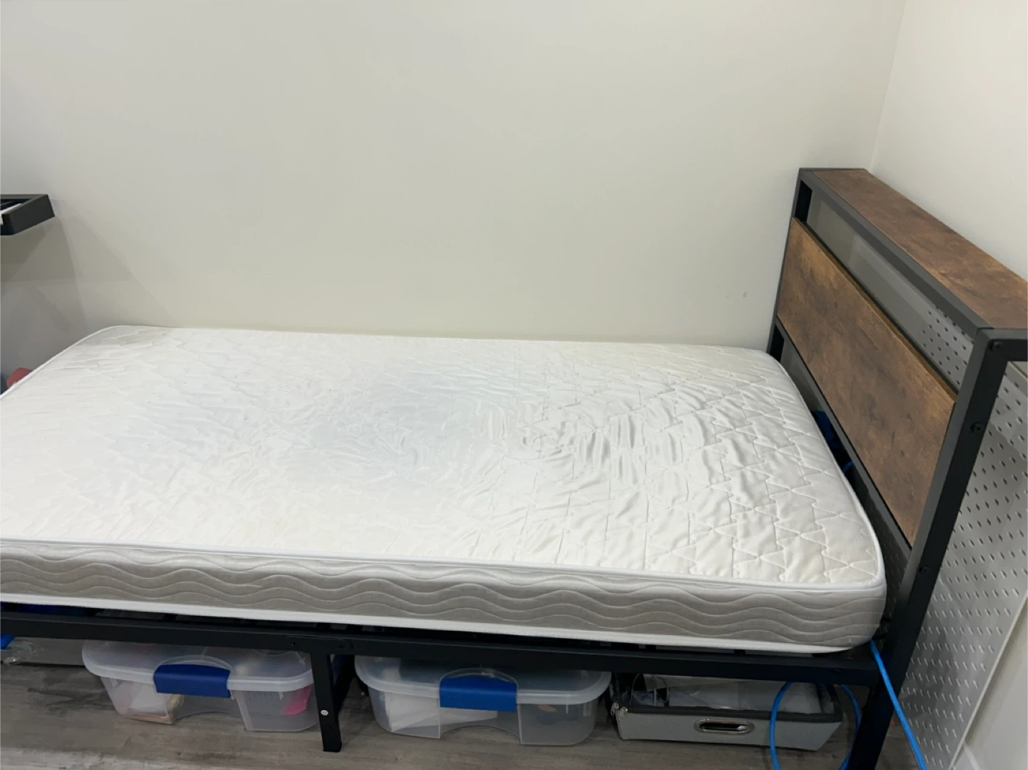 20Mattress: $50 (pickup only) Frame: $60 Both: $100 (pickup only) Twin size mattress. Foam, used for 3 years, clean, no stains. Purchased for $140. Twin metal frame. Disassembled and easy to transport. Easy to assemble, just need an Allen key. Very sturdy featuring a nice wood backboard. Used for around 1 year. 3 missing plastic tabs on metal frame (see picture) but have not noticed any effect. Bought for $130. Selling as I have upgraded. Smoke and pet free home