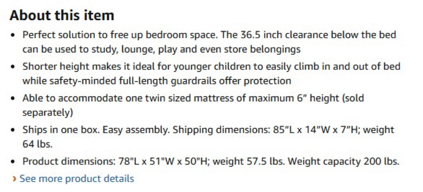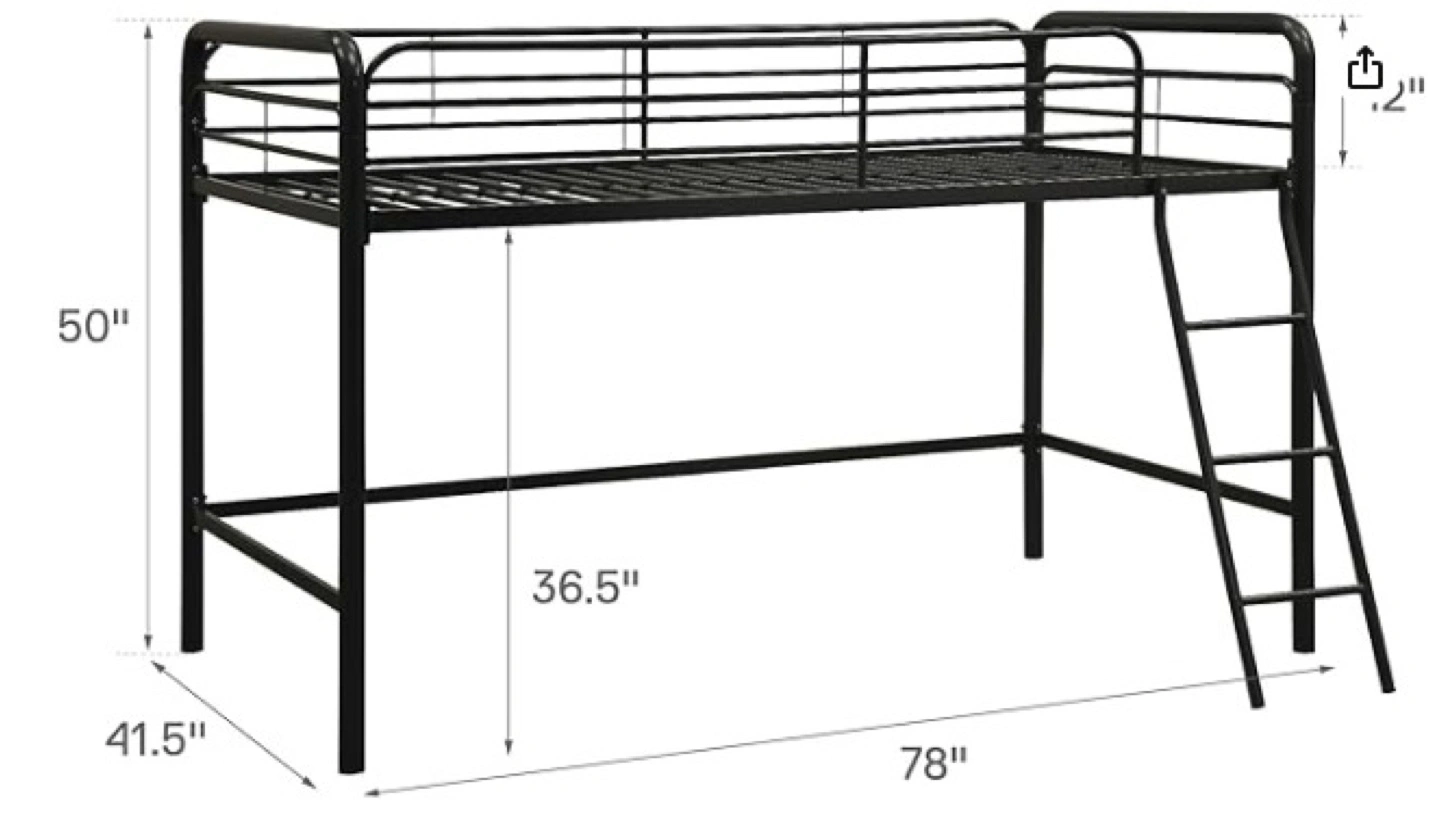 Selling an only used 3 month black metal loft bed frame, no scratch no damage, I am storing them with proper care meanwhile - it is perfect for saving space in a bedroom, DM me if interested! The bed frame's dimensions are 78"L x 51"W x 50"H. The clearance below the bed is 36.5 inches, great for a study or lounge area for children or adults. It also features full-length guardrails for safety. Weight capacity is 200 lbs